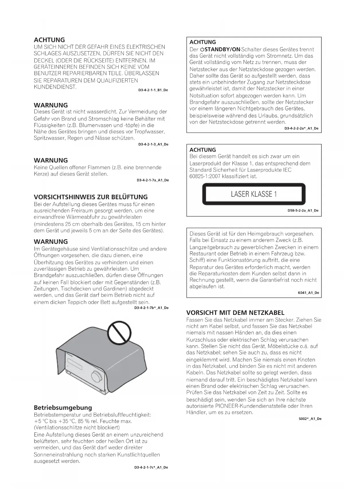 STANDBY/ON -Schalter dieses Gerätes trennt das Gerät nicht vollständig vom Stromnetz. Um das Gerät vollständig vom Netz zu trennen, muss der Netzstecker aus der Netzsteckdose gezogen werden. Daher sollte das Gerät so aufgestellt werden, dass stets ein unbehinderter Zugang zur Netzsteckdose gewährleistet ist, damit der Netzstecker in einer Notsituation sofort abgezogen werden kann. Um Brandgefahr auszuschließen, sollte der Netzstecker vor einem längeren Nichtgebrauch des Gerätes, beispielsweise während des Urlaubs, grundsätzlich von der Netzsteckdose getrennt werden.D3-4-2-2-2a*_A1_De