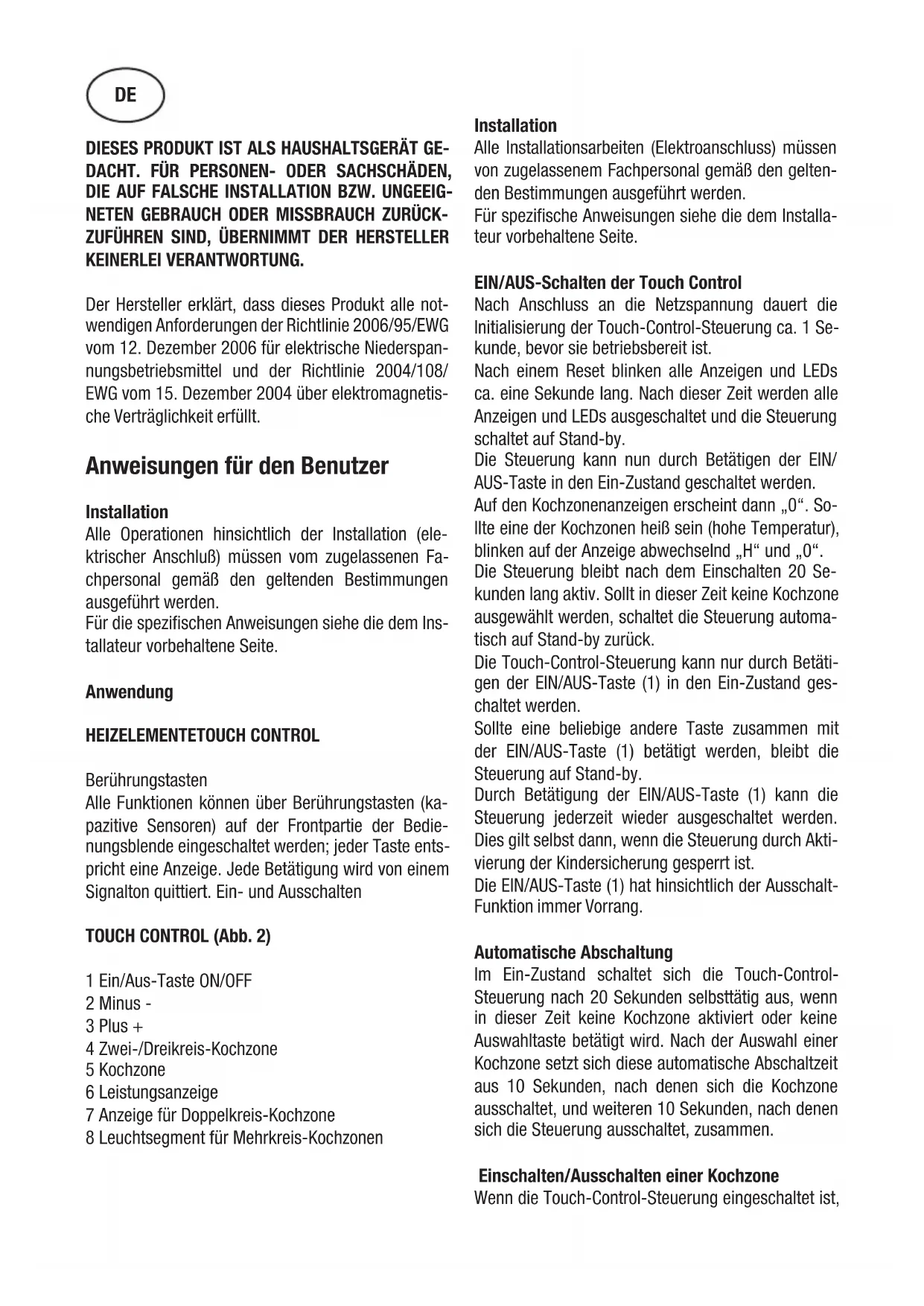 HEIZELEMENTETOUCH CONTROL Berührungstasten
