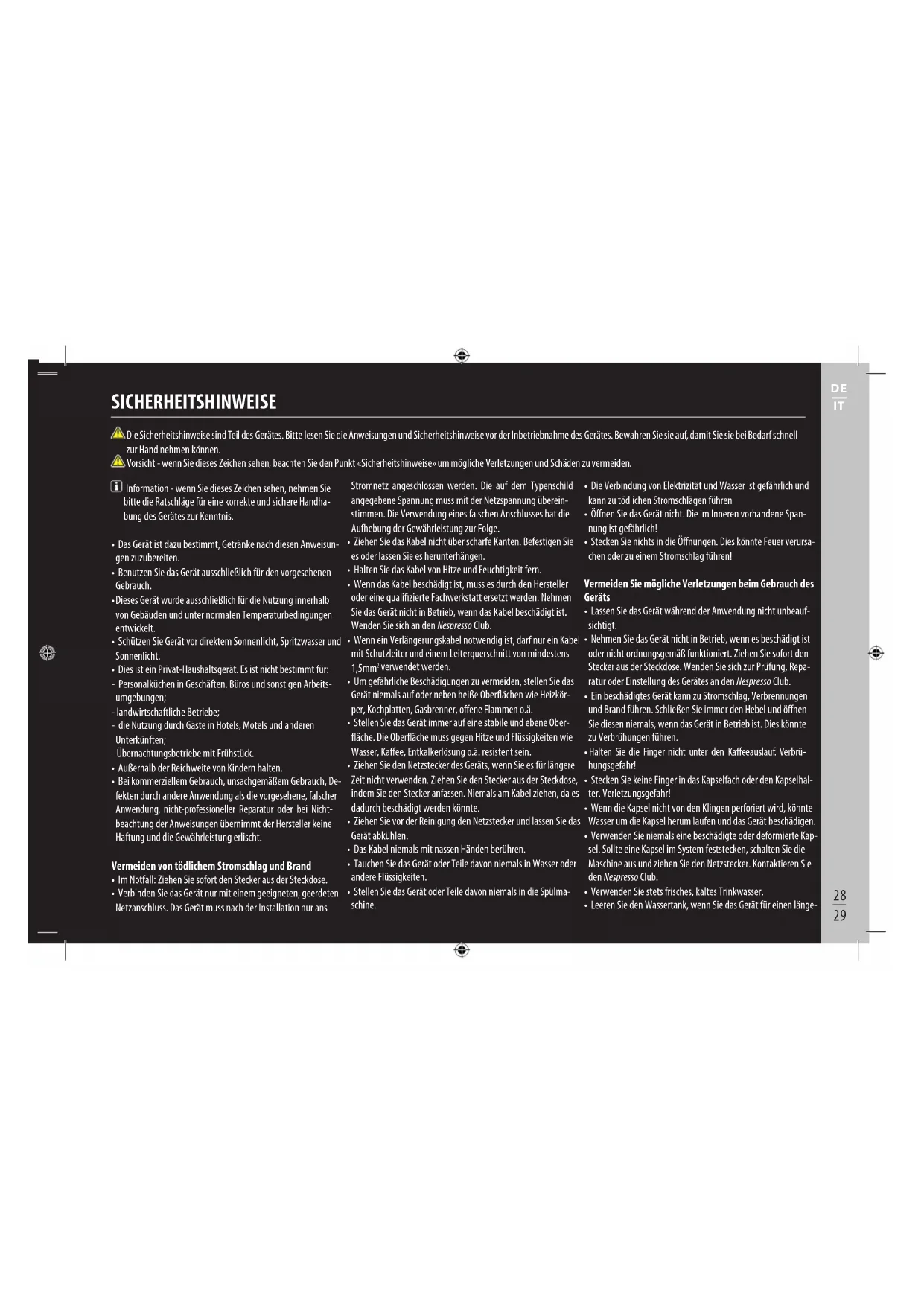 - Nehmen Sie das Gerät nicht in Betrieb, wenn es beschädigt ist oder nicht ordnungsgemäß Funktioniert. Ziehen Sie sofort den Stecker aus der Steckdose. Wenden Sie sich zur Prüfung, Reparatur oder Einstellung des Gerätes an den Nespresso Club.