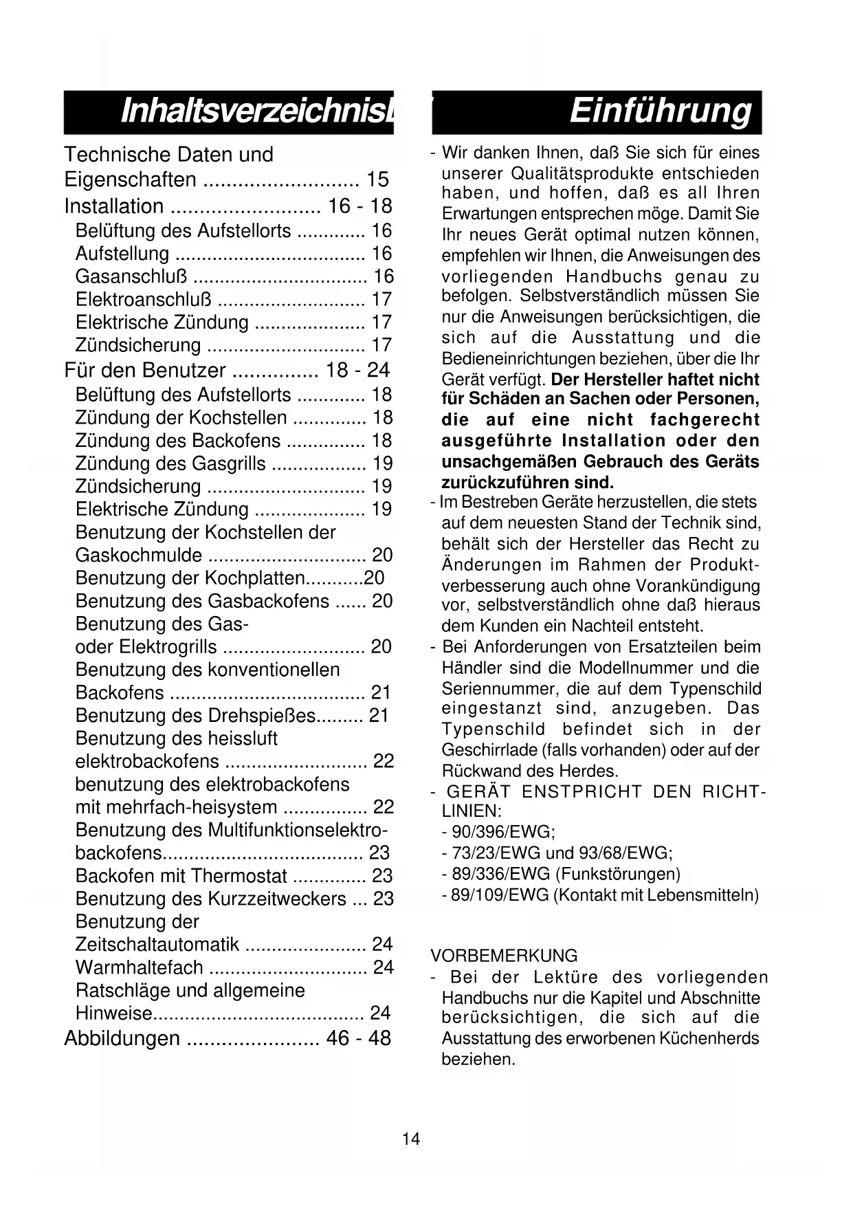- Bei der Lekture des vorliegenden Handbuchs nur die Kapitel und Abschnittte berücksichtigten, die sich auf die Ausstattung des erworbenen Kuchenherds beziehen.