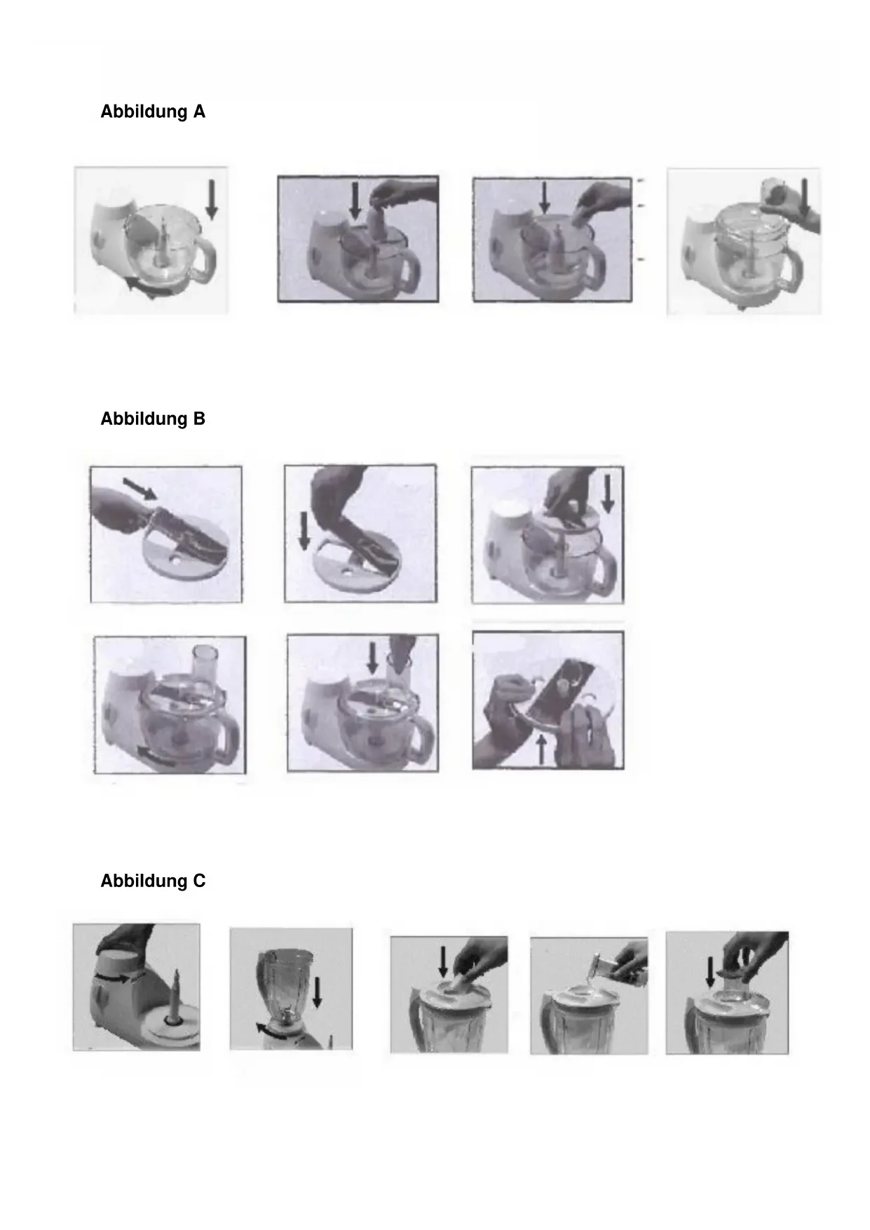 Achtung: Beim Betrieb mit dem Mixbecher sollenen weder Universalmesser noch die Schneid/Raffelscheibe in der Arbeitsschüssel (12) eingesetzt sein. Dabei muss der Deckel der Arbeitsschüssel immer aufgesetzt sein, sonst Funktioniert das Gerät nicht.