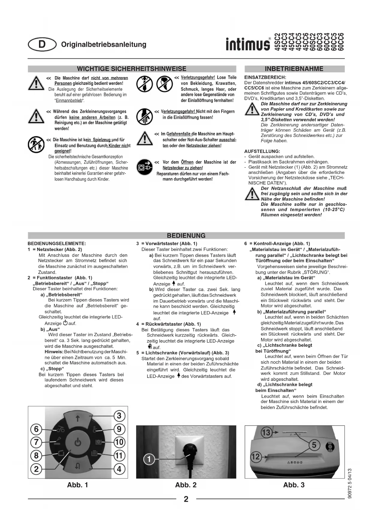 (Seite 2-4) (page 5-7) (page 8-10) (pagina 11-13) (página 14-16) (página 17-19) (pagina 20-22) (Σελίδα23-25) (side 26-28) (side 29-31) (sidan 32-34) (sivulla 35-37) (Strona 38-40) (Strana 41-43) (Oldal 44-46) (стpаници 47-49) (стpаницы 50-52) RUS 45SC2 45CC3 45CC4 45CC5 45CC6 60SC2 60CC3 60CC4 60CC5 60CC6 Betriebsanleitung Operating Instructions Instructions d’opération Gebruiksaanwijzing Instrucciones de uso Instruções de Operação Istruzioni per l’uso Οδηγίεςχρήσης Betjeningsvejledning Bruksveiledning Bruksanvisningen Käyttöohjeet Instrukcjaobsługi Návodkobsluze Kezelésiutasítás Инструкция за експлоатация Инстpyкция по обслyживанию Typ/Type/Tipo/Τύπος/Tyyppi/Típus/Тип: 278-4S + 278-4C + 278-2C + 278-1C + 278-1CF + 279-4S + 279-4C + 279-2C + 279-1C + 279-1CF 90972 5 04/13WICHTIGE SICHERHEITSHINWEISE << Verletzungsgefahr! Lose Teile von Bekleidung, Krawatten, Schmuck, langes Haar, oder andere lose Gegenstände von der Einlaßöffnung fernhalten!<< Verletzungsgefahr! Nicht mit den Fingern in die Einlaßöffnung fassen!<< Im Gefahrenfalle die Maschine am Haupt-schalter oder Not-Aus-Schalter ausschal-ten oder den Netzstecker ziehen! << Vor dem Öffnen der Maschine ist der Netzstecker zu ziehen! Reparaturen dürfen nur von einem Fach-mann durchgeführt werden! << Die Maschine darf nicht von mehreren Personen gleichzeitig bedient werden! Die Auslegung der Sicherheitselemente beruht auf einer gefahrlosen Bedienung im “Einmannbetrieb“.<< Während des Zerkleinerungsvorganges dürfen keine anderen Arbeiten (z. B. Reinigung etc.) an der Maschine getätigt werden!<< Die Maschine ist kein Spielzeug und für Einsatz und Benutzung durch Kinder nicht geeignet! Die sicherheitstechnische Gesamtkonzeption (Abmessungen, Zuführöffnungen, Sicher-heitsabschaltungen etc.) dieser Maschine beinhaltet keinerlei Garantien einer gefahr-losen Handhabung durch Kinder.EINSATZBEREICH:Der Datenshredder intimus 45/60SC2/CC3/CC4/CC5/CC6 ist eine Maschine zum Zerkleinern allge-meinen Schriftgutes sowie Datenträgern wie CD’s, DVD’s, Kreditkarten und 3,5”-Disketten.Die Maschine darf nur zur Zerkleinerung von Papier und Kreditkarten sowie zur Zerkleinerung von CD’s, DVD’s und 3,5”-Disketten verwendet werden!Die Zerkleinerung andersartiger Daten-träger können Schäden am Gerät (z.B. Zerstörung des Schneidwerkes etc.) zur Folge haben.AUFSTELLUNG:- Gerät auspacken und aufstellen.- Plastiksack im Sackrahmen einhängen.- Gerät mit Netzstecker (1) (Abb. 2) am Stromnetz anschließen (Angaben über die erforderliche Vorsicherung der Netzsteckdose siehe „TECH-NISCHE DATEN“).Der Netzanschluß der Maschine muß frei zugängig sein und sollte sich in der Nähe der Maschine benden!Die Maschine sollte nur in geschlos-senen und temperierten (10-25°C) Räumen eingesetzt werden!