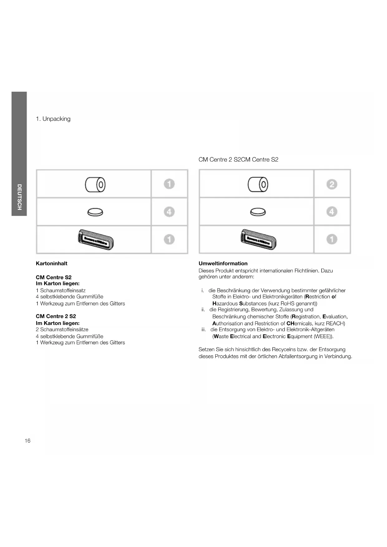 Kartoninhalt CM Centre S2 Im Karton liegen: 1 Schaumstoffeinsatz 4 selbstklebende Gummifüße 1 Werkzeug zum Entfernen des Gitters CM Centre 2 S2 Im Karton liegen: 2 Schaumstoffeinsätze 4 selbstklebende Gummifüße 1 Werkzeug zum Entfernen des Gitters Umweltinformation Dieses Produkt entspricht internationalen Richtlinien. Dazu gehören unter anderem: