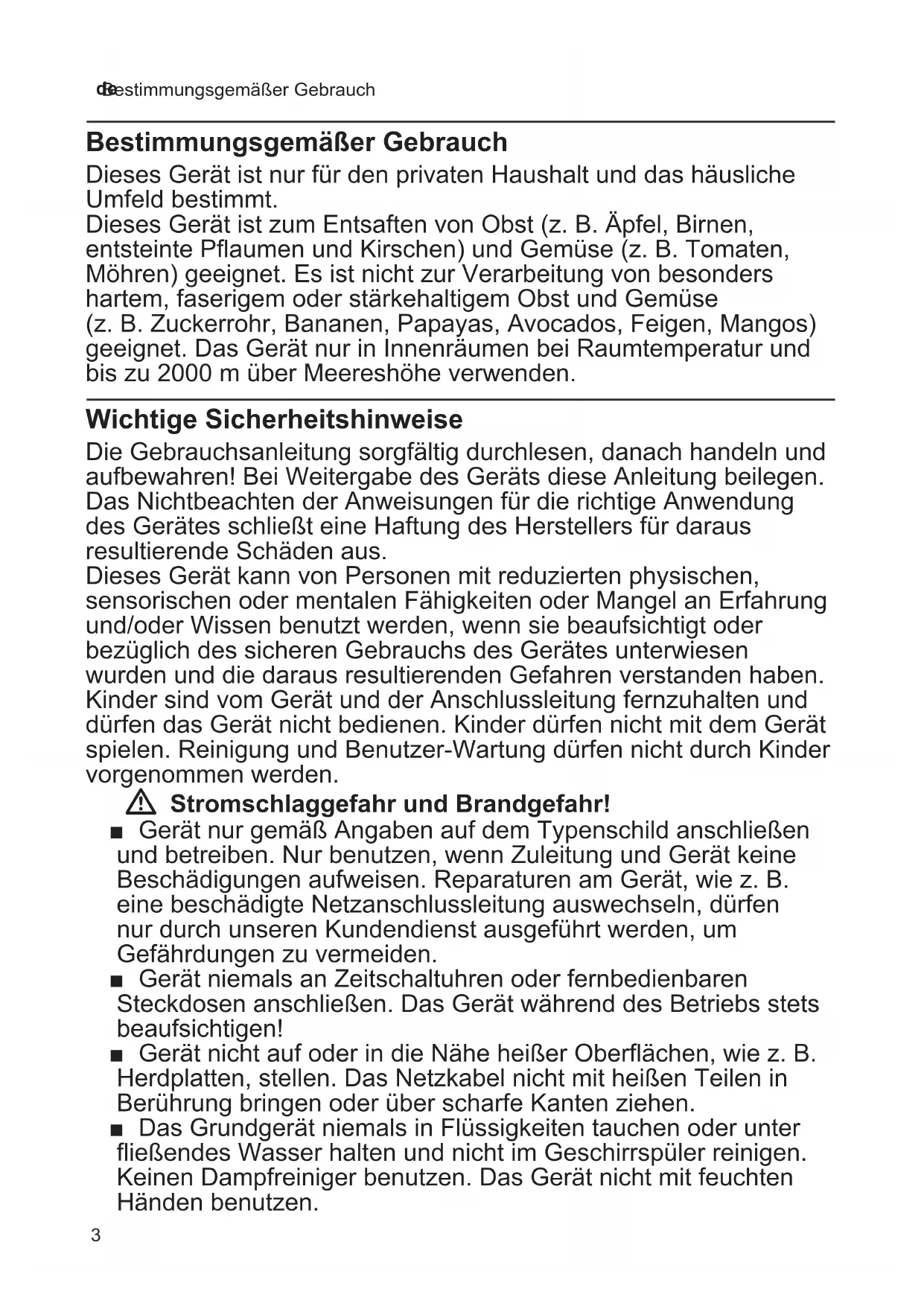 Dieses Gerät ist zum Entsaften von Obst (z. B. Äpfel, Birnen,