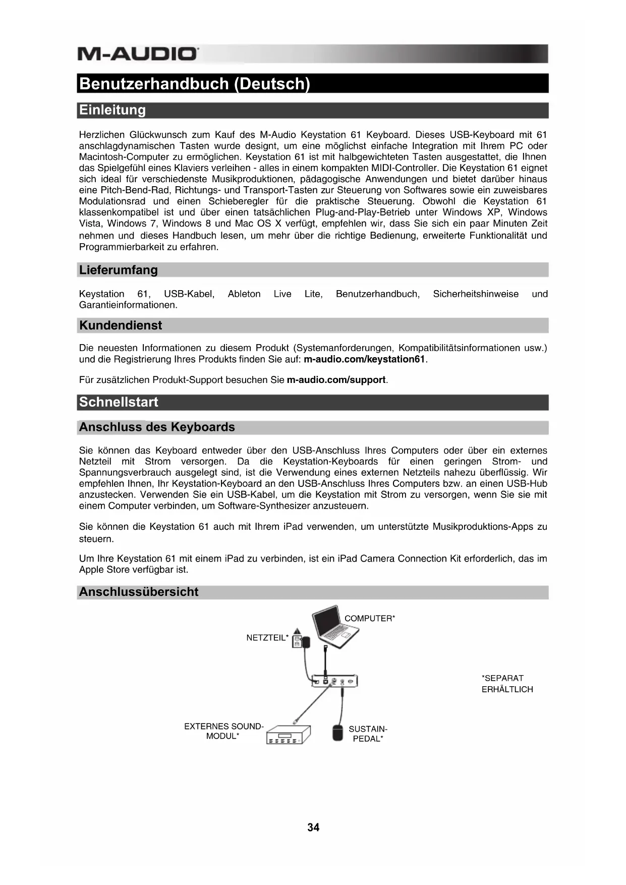 Lieferumfang Keystation 61, USB-Kabel, Ableton Live Lite, Benutzerhandbuch, Sicherheitshinweise und Garantieinformationen. Kundendienst Die neuesten Informationen zu diesem Produkt (Systemanforderungen, Kompatibilitätsinformationen usw.) und die Registrierung Ihres Produkts finden Sie auf: m-audio.com/keystation61. Für zusätzlichen Produkt-Support besuchen Sie m-audio.com/support. Schnellstart Anschluss des Keyboards Sie können das Keyboard entweder über den USB-Anschluss Ihres Computers oder über ein externes Netzteil mit Strom versorgen. Da die Keystation-Keyboards für einen geringen Strom- und Spannungsverbrauch ausgelegt sind, ist die Verwendung eines externen Netzteils nahezu überflüssig. Wir empfehlen Ihnen, Ihr Keystation-Keyboard an den USB-Anschluss Ihres Computers bzw. an einen USB-Hub anzustecken. Verwenden Sie ein USB-Kabel, um die Keystation mit Strom zu versorgen, wenn Sie sie mit einem Computer verbinden, um Software-Synthesizer anzusteuern. Sie können die Keystation 61 auch mit Ihrem iPad verwenden, um unterstützte Musikproduktions-Apps zu steuern. Um Ihre Keystation 61 mit einem iPad zu verbinden, ist ein iPad Camera Connection Kit erforderlich, das im Apple Store verfügbar ist. Anschlussübersicht