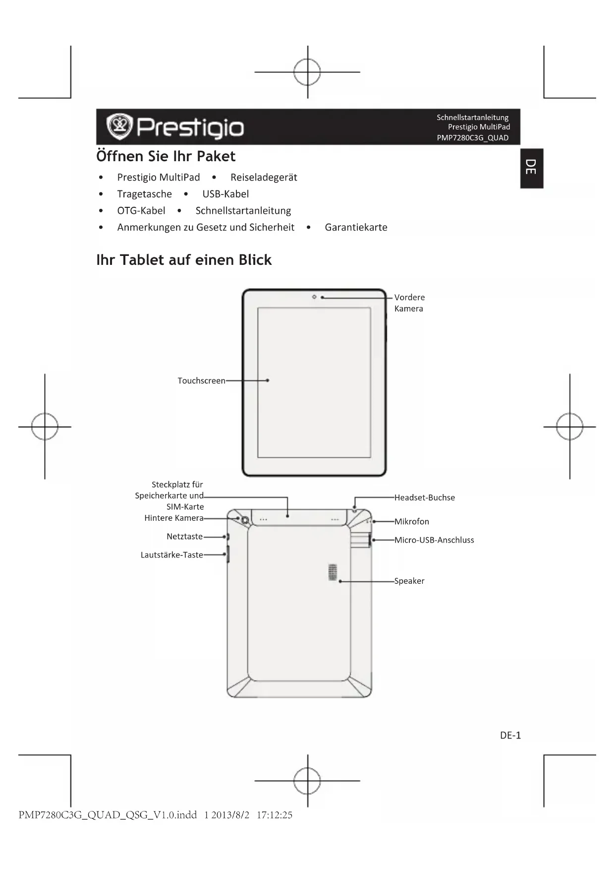 - AnmerkungenzuGesetzundSicherheit • Garantiekarte Ihr Tablet auf einen Blick Touchscreen Vordere Kamera Netztaste Headset-Buchse Micro-USB-Anschluss Lautstärke-Taste Steckplatzfür Speicherkarteund SIM-Karte HintereKamera Speaker Mikrofon PMP7280C3G_QUAD_QSG_V1.0.indd 1 2013/8/2 17:12:25DE-2