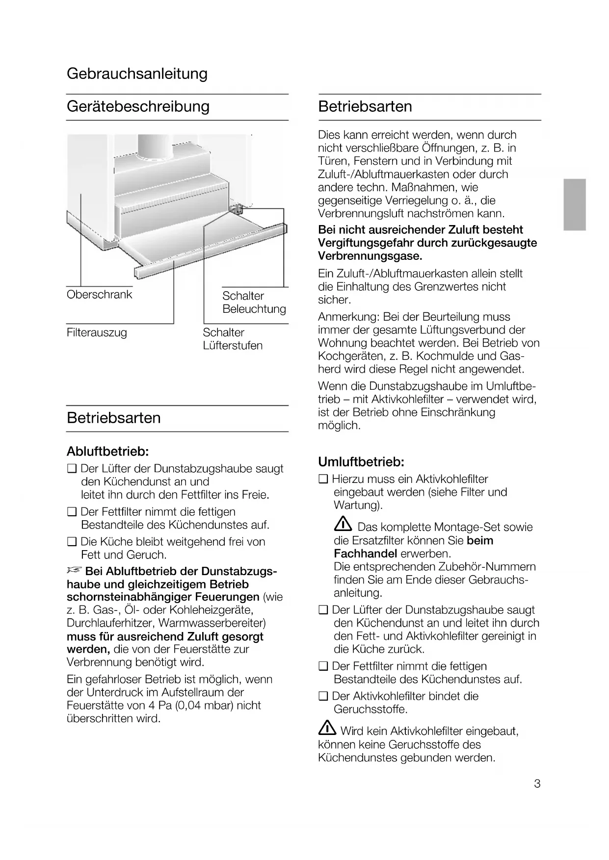 Wichtige Hinweise: ❑ Diese Gebrauchsanleitung gilt für mehrere Geräte-Ausführungen. Es ist möglich, dass einzelneAusstattungsmerkmale beschriebensind, die nicht auf Ihr Gerät zutreffen.❑ Diese Dunstabzugshaube entspricht deneinschlägigen Sicherheitsbestimmungen.Reparaturen dürfen nur von Fachkräftendurchgeführt werden.Durch unsachgemäße Reparaturen können erhebliche Gefahren für denBenutzer entstehen. Unter der Dunstabzugshaube nicht flambieren.Brandgefahr am Fettfilter durch ! aufsteigende Flammen.