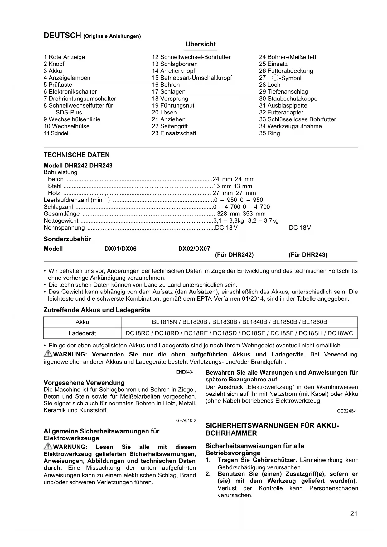 BEDIENUNGSANLEITUNG DHR242 MAKITA