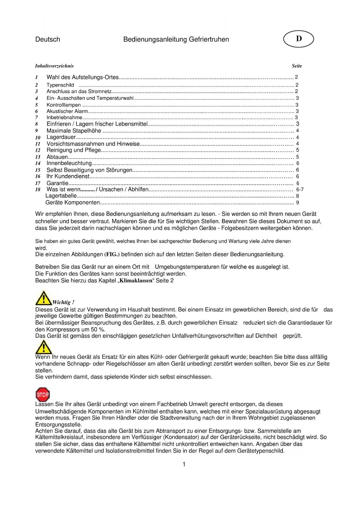 Wenn Ihr neues Gerat als Ersatz fur ein altes Kuhl- oder Gefriergerat gkauft wurd; beachten Sieitte dass allfaily vorhandene Schnapp- oder Riegelschlsser am alten Gerat unbedingt zerstort werden sollenen, bevor Sie es zur Seite stellen.