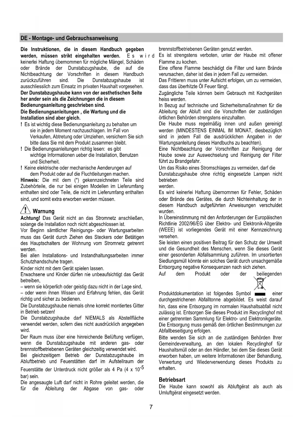 Bei gleichzeitigem Betrieb der Dunstabzugshaube im Abluftbetrieb und Feuerstätten darf im Aufstellraum der Feuerstätte der Unterdruck nicht länger als 4 Pa (4 x 10^-5 bar) sein.