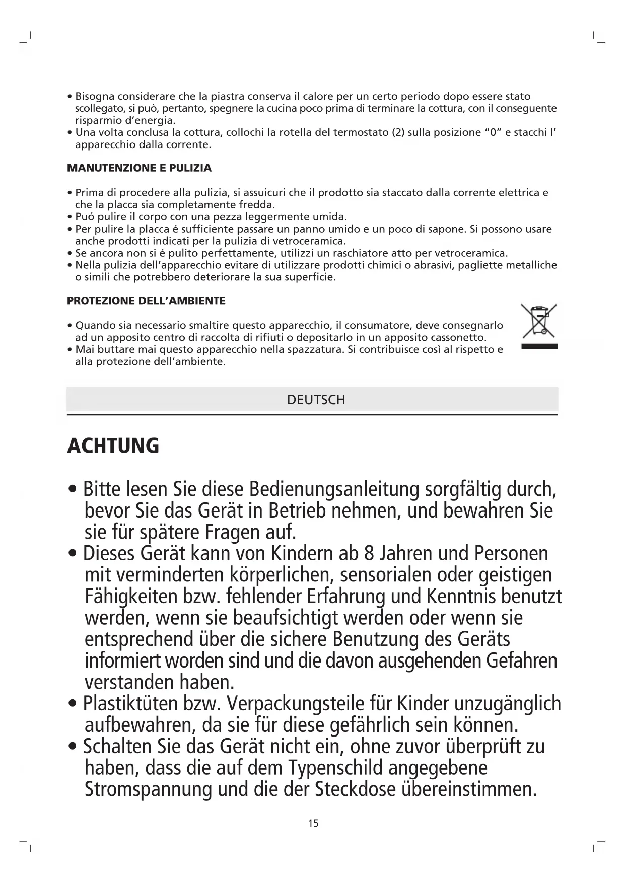 - Die vom Anwender durchzuführende Reinigung und Wartung darf nicht durch die Kinder erfolgen, es sei denn, sie sind älter als 8 Jahre und werden beaufsichtigt.