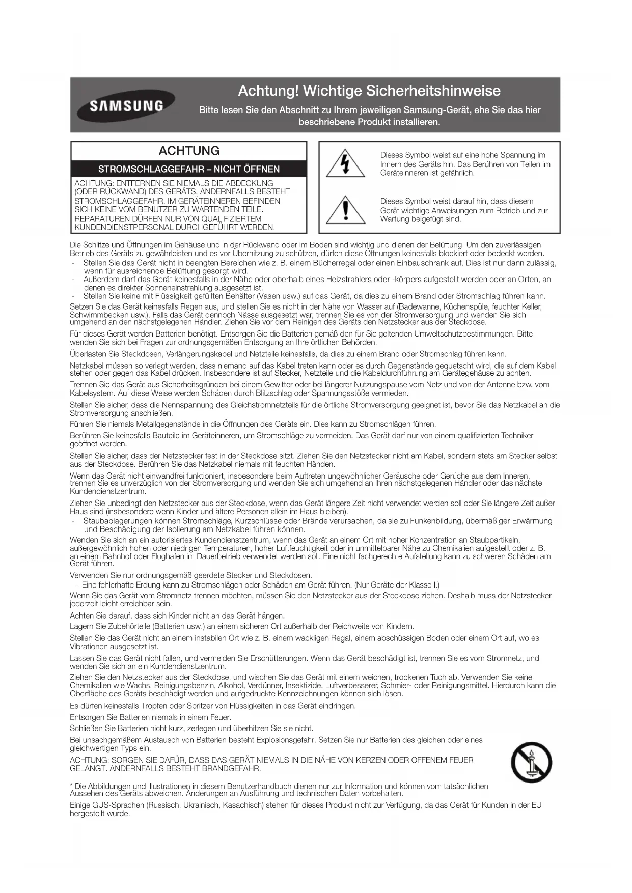 ACHTUNG: SORGEN SIE DAFÜR, DASS DAS GERÄT NIEMALS IN DIE NÄHE VON KERZEN ODER OFFENEM FEUER GELANGT. ANDERNFALLS BESTEHT BRANDGEFAHR.