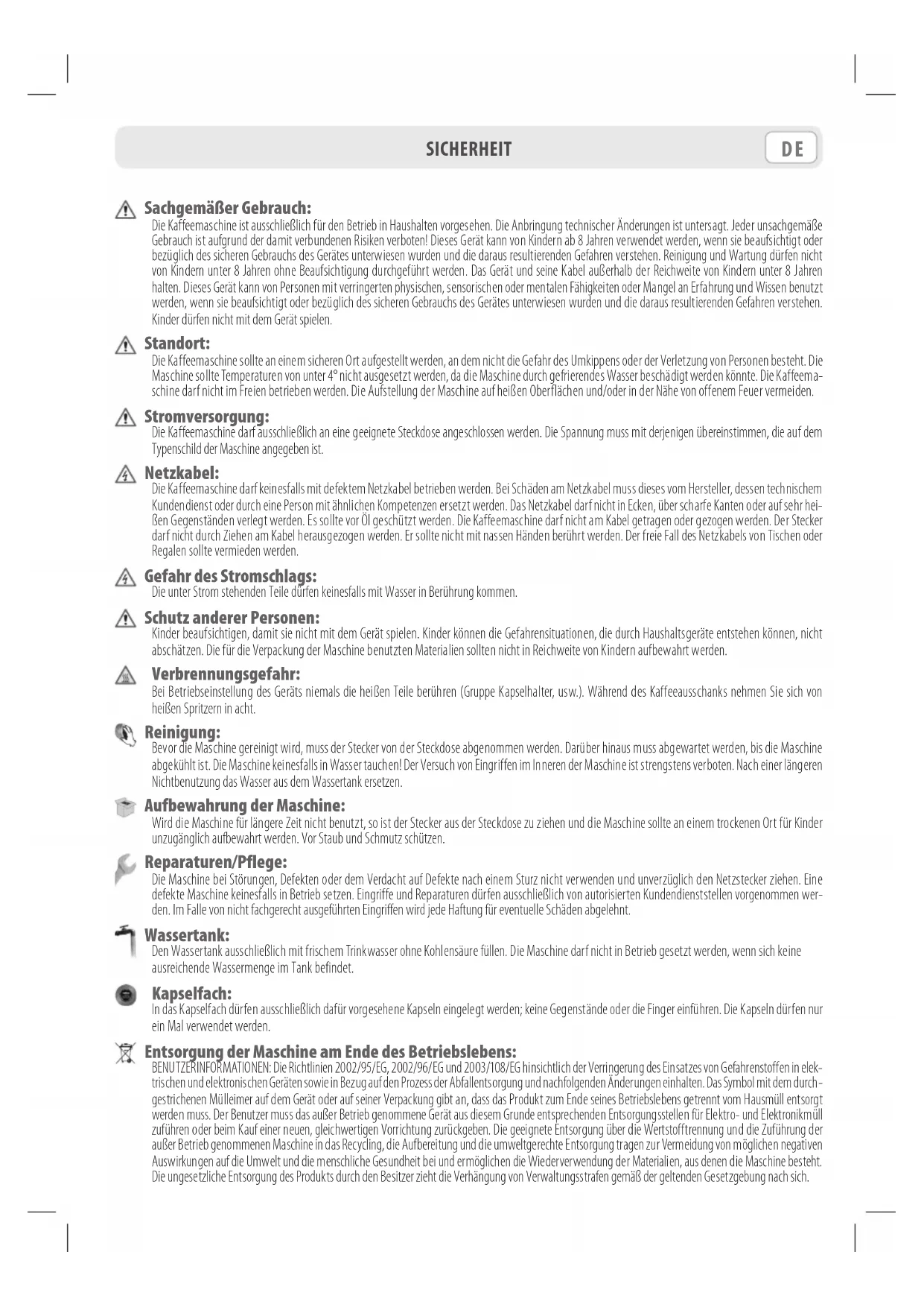 Sachgemäßer Gebrauch: Die Kaffeemaschine ist ausschließlich für den Betrieb in Haushalten vorgesehen. Die Anbringung technischer Änderungen ist untersagt. Jeder unsachgemäße Gebrauch ist aufgrund der damit verbundenen Risiken verboten! Dieses Gerät kann von Kindern ab 8 Jahren verwendet werden, wenn sie beaufsichtigt oder bezüglich des sicheren Gebrauchs des Gerätes unterwiesen wurden und die daraus resultierenden Gefahren verstehen. Reinigung und Wartung dürfen nicht von Kindern unter 8 Jahren ohne Beaufsichtigung durchgeführt werden. Das Gerät und seine Kabel außerhalb der Reichweite von Kindern unter 8 Jahren halten. Dieses Gerät kann von Personen mit verringerten physischen, sensorischen oder mentalen Fähigkeiten oder Mangel an Erfahrung und Wissen benutzt werden, wenn sie beaufsichtigt oder bezüglich des sicheren Gebrauchs des Gerätes unterwiesen wurden und die daraus resultierenden Gefahren verstehen. Kinder dürfen nicht mit dem Gerät spielen. Standort: Die Kaffeemaschine sollte an einem sicheren Ort aufgestellt werden, an dem nicht die Gefahr des Umkippens oder der Verletzung von Personen besteht. Die Maschine sollte Temperaturen von unter 4° nicht ausgesetzt werden, da die Maschine durch gefrierendes Wasser beschädigt werden könnte. Die Kaffeema- schine darf nicht im Freien betrieben werden. Die Aufstellung der Maschine auf heißen Oberflächen und/oder in der Nähe von offenem Feuer vermeiden. Stromversorgung: Die Kaffeemaschine darf ausschließlich an eine geeignete Steckdose angeschlossen werden. Die Spannung muss mit derjenigen übereinstimmen, die auf dem Typenschild der Maschine angegeben ist. Netzkabel: Die Kaffeemaschine darf keinesfalls mit defektem Netzkabel betrieben werden. Bei Schäden am Netzkabel muss dieses vom Hersteller, dessen technischem Kundendienst oder durch eine Person mit ähnlichen Kompetenzen ersetzt werden. Das Netzkabel darf nicht in Ecken, über scharfe Kanten oder auf sehr hei- ßen Gegenständen verlegt werden. Es sollte vor Öl geschützt werden. Die Kaffeemaschine darf nicht am Kabel getragen oder gezogen werden. Der Stecker darf nicht durch Ziehen am Kabel herausgezogen werden. Er sollte nicht mit nassen Händen berührt werden. Der freie Fall des Netzkabels von Tischen oder Regalen sollte vermieden werden. Gefahr des Stromschlags: Die unter Strom stehenden Teile dürfen keinesfalls mit Wasser in Berührung kommen. Schutz anderer Personen: Kinder beaufsichtigen, damit sie nicht mit dem Gerät spielen. Kinder können die Gefahrensituationen, die durch Haushaltsgeräte entstehen können, nicht abschätzen. Die für die Verpackung der Maschine benutzten Materialien sollten nicht in Reichweite von Kindern aufbewahrt werden. Verbrennungsgefahr: Bei Betriebseinstellung des Geräts niemals die heißen Teile berühren (Gruppe Kapselhalter, usw.). Während des Kaffeeausschanks nehmen Sie sich von heißen Spritzern in acht. Reinigung: Bevor die Maschine gereinigt wird, muss der Stecker von der Steckdose abgenommen werden. Darüber hinaus muss abgewartet werden, bis die Maschine abgekühlt ist. Die Maschine keinesfalls in Wasser tauchen! Der Versuch von Eingriffen im Inneren der Maschine ist strengstens verboten. Nach einer längeren Nichtbenutzung das Wasser aus dem Wassertank ersetzen. Aufbewahrung der Maschine: Wird die Maschine für längere Zeit nicht benutzt, so ist der Stecker aus der Steckdose zu ziehen und die Maschine sollte an einem trockenen Ort für Kinder unzugänglich aufbewahrt werden. Vor Staub und Schmutz schützen. Reparaturen/Pflege: Die Maschine bei Störungen, Defekten oder dem Verdacht auf Defekte nach einem Sturz nicht verwenden und unverzüglich den Netzstecker ziehen. Eine defekte Maschine keinesfalls in Betrieb setzen. Eingriffe und Reparaturen dürfen ausschließlich von autorisierten Kundendienststellen vorgenommen wer- den. Im Falle von nicht fachgerecht ausgeführten Eingriffen wird jede Haftung für eventuelle Schäden abgelehnt. Wassertank: Den Wassertank ausschließlich mit frischem Trinkwasser ohne Kohlensäure füllen. Die Maschine darf nicht in Betrieb gesetzt werden, wenn sich keine ausreichende Wassermenge im Tank befindet. Kapselfach: In das Kapselfach dürfen ausschließlich dafür vorgesehene Kapseln eingelegt werden; keine Gegenstände oder die Finger einführen. Die Kapseln dürfen nur ein Mal verwendet werden. Entsorgung der Maschine am Ende des Betriebslebens: BENUTZERINFORMATIONEN: Die Richtlinien 2002/95/EG, 2002/96/EG und 2003/108/EG hinsichtlich der Verringerung des Einsatzes von Gefahrenstoffen in elek- trischen und elektronischen Geräten sowie in Bezug auf den Prozess der Abfallentsorgung und nachfolgenden Änderungen einhalten. Das Symbol mit dem durch- gestrichenen Mülleimer auf dem Gerät oder auf seiner Verpackung gibt an, dass das Produkt zum Ende seines Betriebslebens getrennt vom Hausmüll entsorgt werden muss. Der Benutzer muss das außer Betrieb genommene Gerät aus diesem Grunde entsprechenden Entsorgungsstellen für Elektro- und Elektronikmüll zuführen oder beim Kauf einer neuen, gleichwertigen Vorrichtung zurückgeben. Die geeignete Entsorgung über die Wertstofftrennung und die Zuführung der außer Betrieb genommenen Maschine in das Recycling, die Aufbereitung und die umweltgerechte Entsorgung tragen zur Vermeidung von möglichen negativen Auswirkungen auf die Umwelt und die menschliche Gesundheit bei und ermöglichen die Wiederverwendung der Materialien, aus denen die Maschine besteht. Die ungesetzliche Entsorgung des Produkts durch den Besitzer zieht die Verhängung von Verwaltungsstrafen gemäß der geltenden Gesetzgebung nach sich.BESTANDTEILE DER MASCHINE