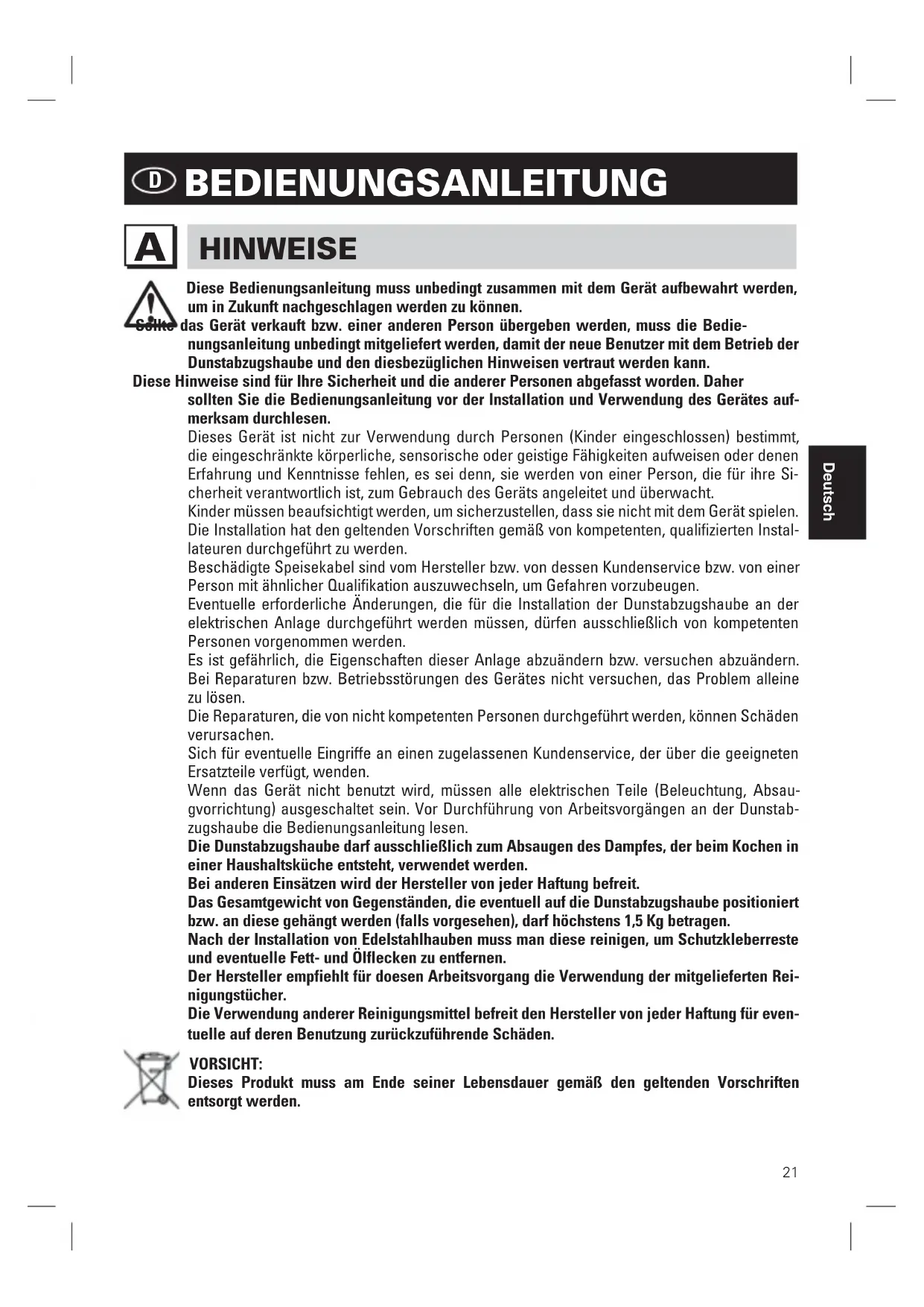 D BEDIENUNGSANLEITUNG HINWEISE A Diese Bedienungsanleitung muss unbedingt zusammen mit dem Gerät aufbewahrt werden,