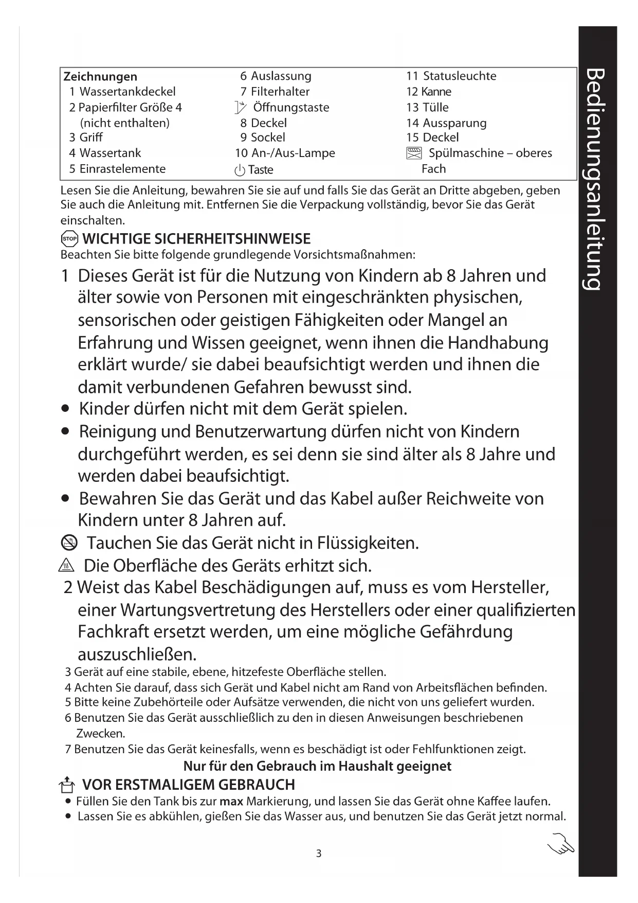 •Füllen Sie den Tank bis zur max Markierung, und lassen Sie das Gerät ohne Kaffee laufen. •Lassen Sie es abkühlen, gießen Sie das Wasser aus, und benutzen Sie das Gerät jetzt normal. Bedienungsanleitung Zeichnungen1 Wassertankdeckel2 Papierfilter Größe 4 (nicht enthalten)3 Griff4 Wassertank5 Einrastelemente6 Auslassung7 FilterhalterkÖffnungstaste8 Deckel9 Sockel10 An-/Aus-Lampe2 Taste11 Statusleuchte12 Kanne13 Tülle14 Aussparung15 Deckel¬ Spülmaschine – oberes Fach4