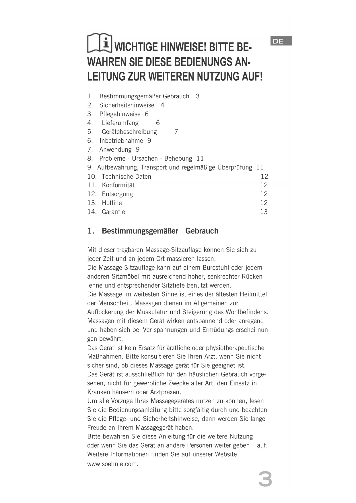 Mit dieser tragbaren Massage-Sitzauflage können Sie sich zu jeder Zeit und an jedem Ort massieren lassen.Die Massage-Sitzauflage kann auf einem Bürostuhl oder jedem anderen Sitzmöbel mit ausreichend hoher, senkrechter Rücken-lehne und entsprechender Sitztiefe benutzt werden.Die Massage im weitesten Sinne ist eines der ältesten Heilmittel der Menschheit. Massagen dienen im Allgemeinen zur Auflockerung der Muskulatur und Steigerung des Wohlbefindens. Massagen mit diesem Gerät wirken entspannend oder anregend und haben sich bei Ver spannungen und Ermüdungs erschei nun-gen bewährt. 'DV*HUÃWLVWNHLQ(UVDW]IđUÃU]WOLFKHRGHUSK\VLRWKHUDSHXWLVFKHMaßnahmen. Bitte konsultieren Sie Ihren Arzt, wenn Sie nicht sicher sind, ob dieses Massage gerät für Sie geeignet ist. Das Gerät ist ausschließlich für den häuslichen Gebrauch vorge-sehen, nicht für gewerbliche Zwecke aller Art, den Einsatz in Kranken häusern oder Arztpraxen.Um alle Vorzüge Ihres Massagegerätes nutzen zu können, lesen Sie die Bedienungsanleitung bitte sorgfältig durch und beachten Sie die Pflege- und Sicherheitshinweise, dann werden Sie lange Freude an Ihrem Massagegerät haben.Bitte bewahren Sie diese Anleitung für die weitere Nutzung –oder wenn Sie das Gerät an andere Personen weiter geben – auf.Weitere Informationen finden Sie auf unserer Website www.soehnle.com.