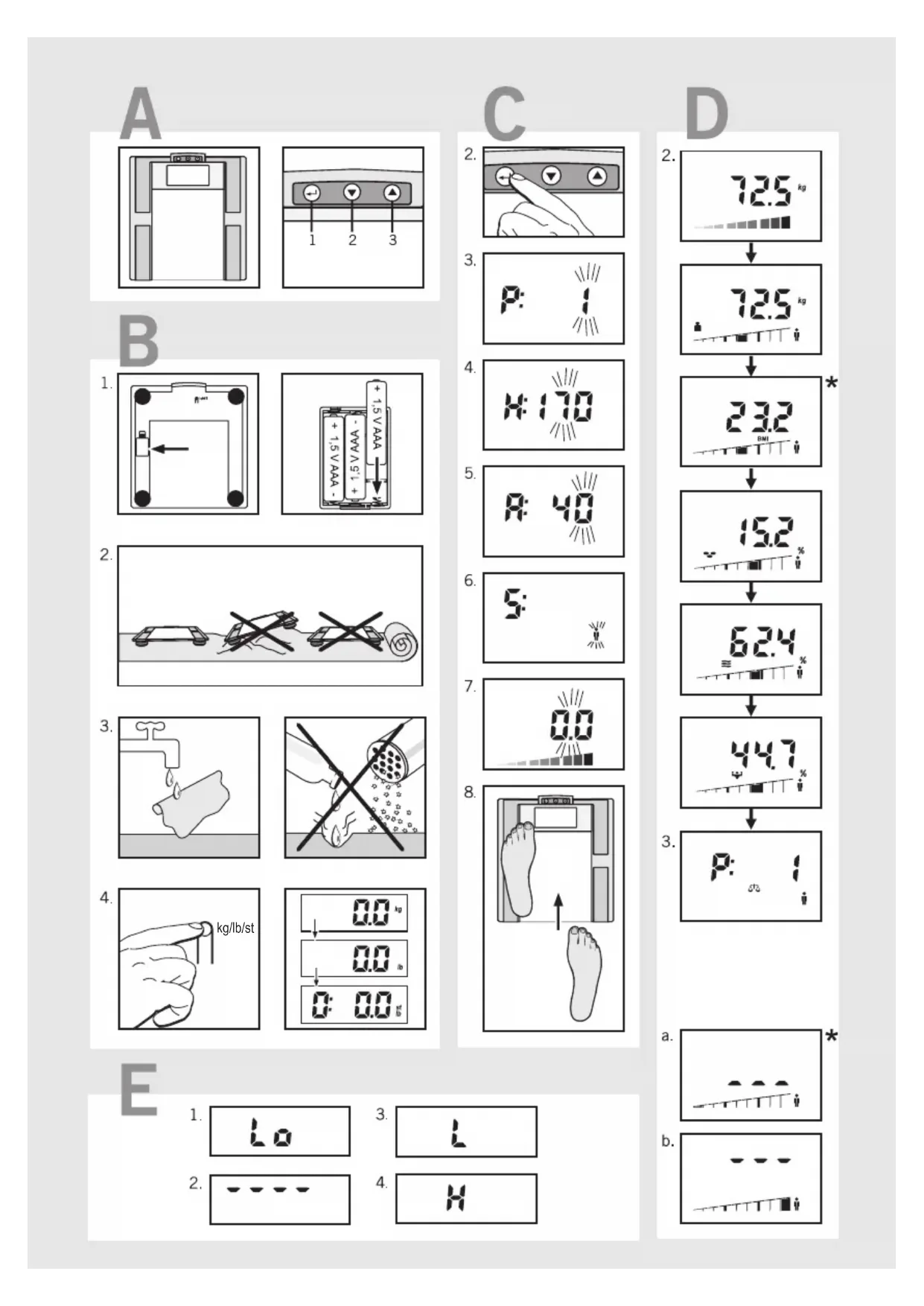 für den zweiten angezeigten Speicherplatz). Dann werden Körpergewicht, BMI, Körperfett-, Körperwasser- und Muskel anteil angezeigt. Bei Gewichtsschwankungen zur letzten Messung von mehr als +/-3 kg wird der Benutzer nicht erkannt, so dass die Dateneingabe wiederholt werden muss.