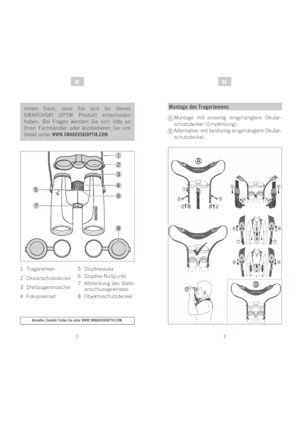Vielen Dank, dass Sie sich für dieses SWAROVSKI OPTIK Produkt entschieden haben. Bei Fragen wenden Sie sich bitte an Ihren Fachhändler oder kontaktieren Sie uns direkt unter WWW.SWAROVSKIOPTIK.COM. Aktuelles Zubehör finden Sie unter WWW.SWAROVSKIOPTIK.COM. 1 Trageriemen 2 Okularschutzdeckel 3 Drehaugenmuschel 4 Fokussierrad 5 Dioptrieskala 6 Dioptrie-Nullpunkt 7 Abdeckung des Stativ- anschlussgewindes 8 Objektivschutzdeckel Montage des Trageriemens Montage mit einseitig eingehängtem Okular- schutzdeckel (Empfehlung). Alternative: mit beidseitig eingehängtem Okular- schutzdeckel.