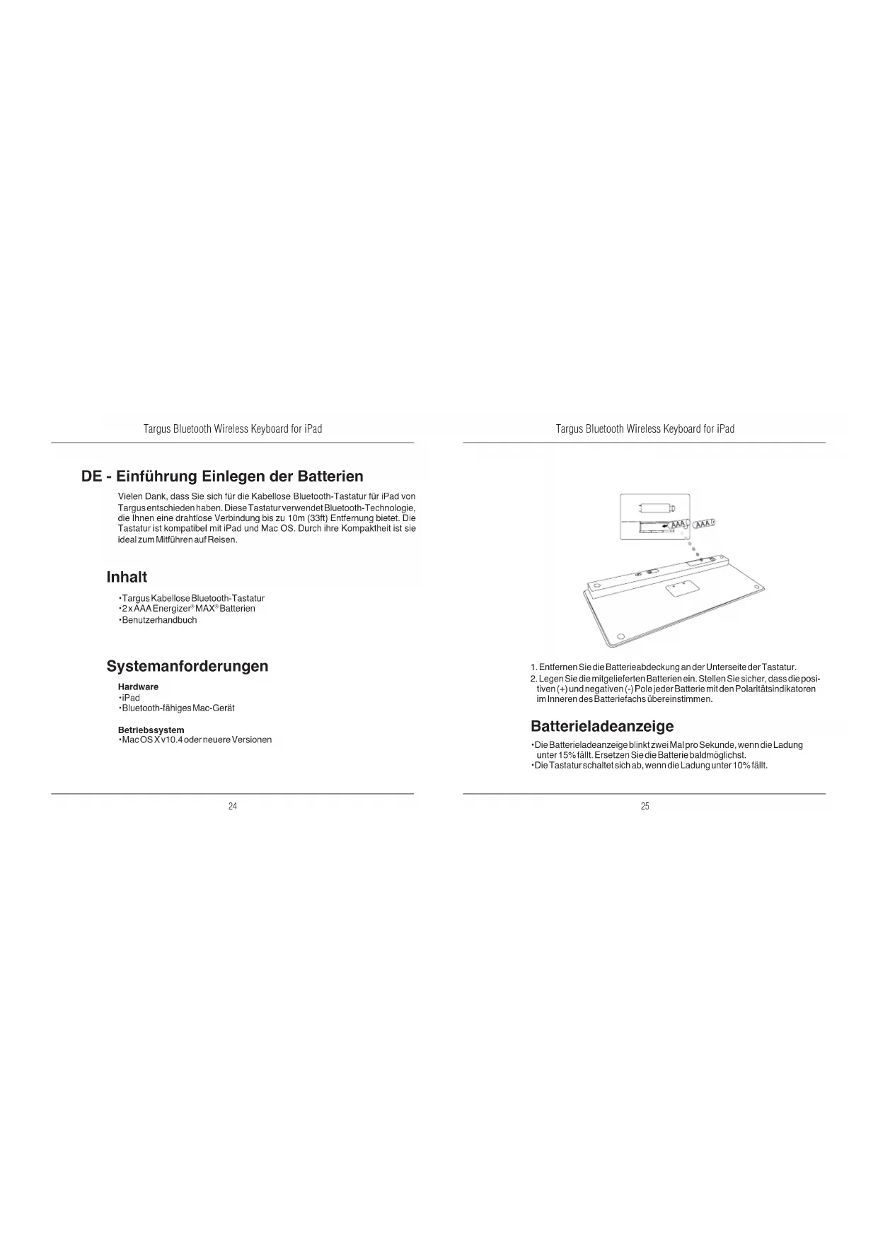 DE - Einführung Einlegen der Batterien Batterieladeanzeige Inhalt Systemanforderungen Vielen Dank, dass Sie sich für die Kabellose Bluetooth-Tastatur für iPad von Targus entschieden haben. Diese Tastatur verwendet Bluetooth-Technologie, die Ihnen eine drahtlose Verbindung bis zu 10m (33ft) Entfernung bietet. Die Tastatur ist kompatibel mit iPad und Mac OS. Durch ihre Kompaktheit ist sie ideal zum Mitführen auf Reisen.