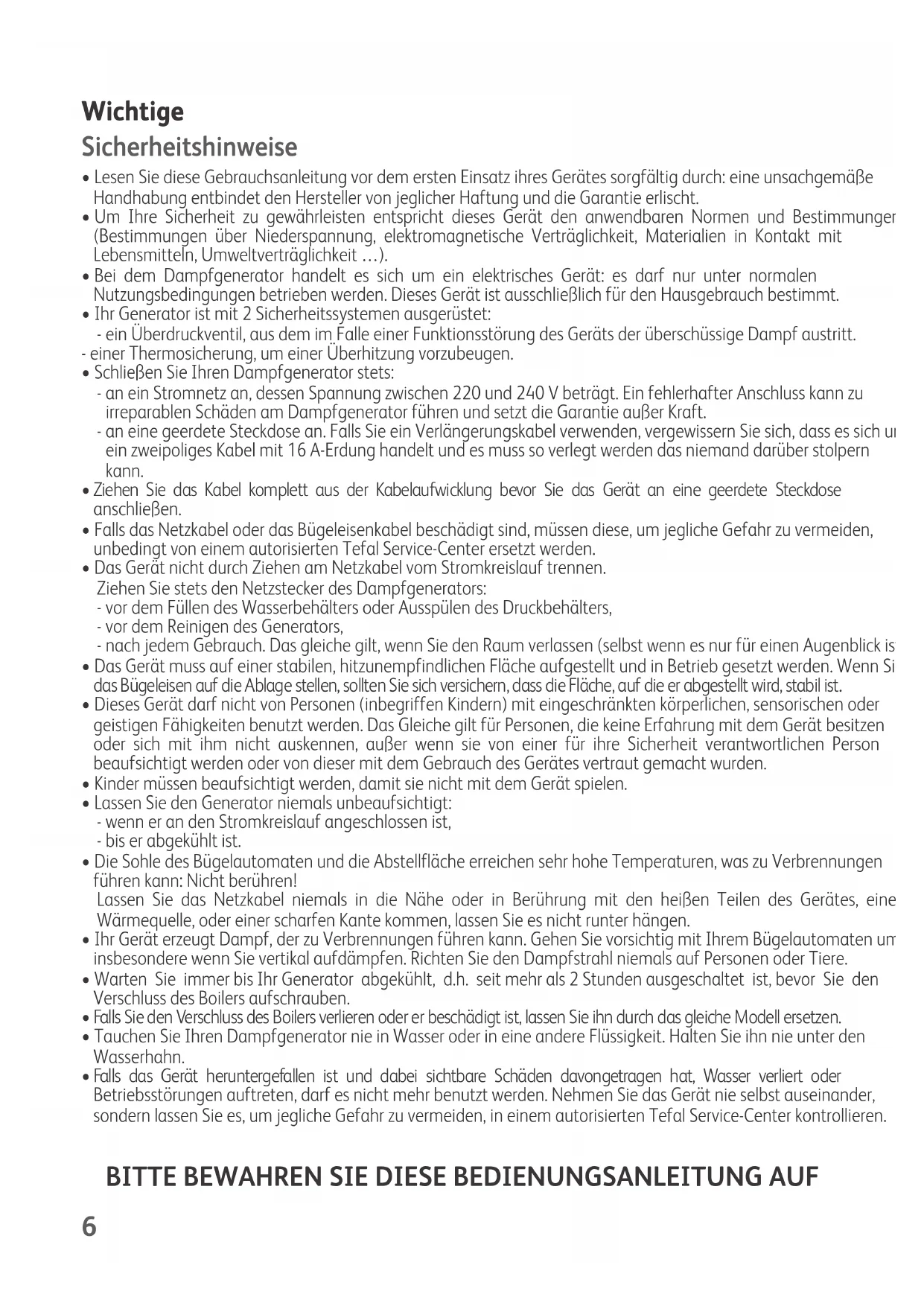 • Bei dem Dampfgenerator handelt es sich um ein elektrisches Gerät: es darf nur unter normalen