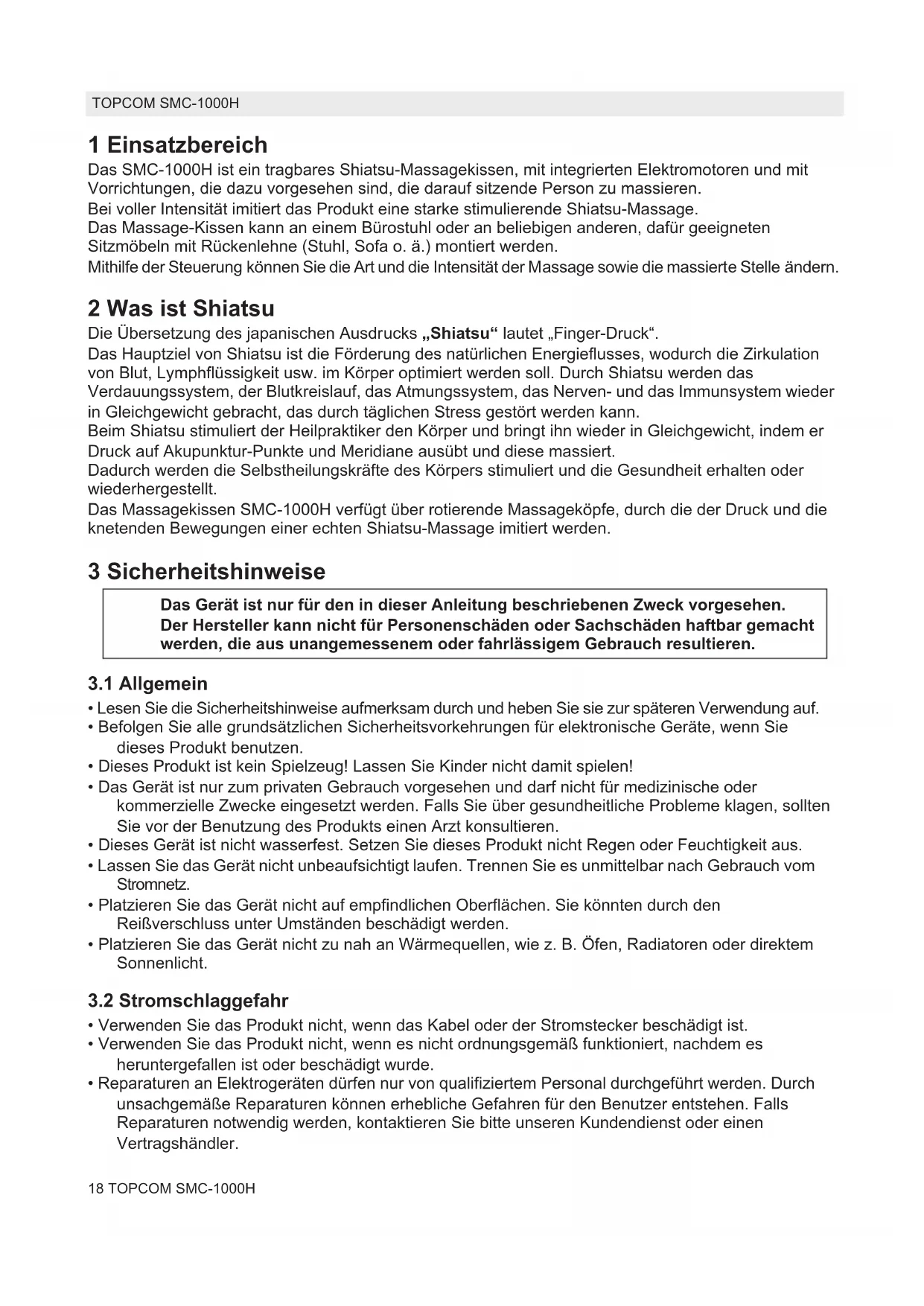 1 Einsatzbereich Das SMC-1000H ist ein tragbares Shiatsu-Massagekissen, mit integrierten Elektromotoren und mit Vorrichtungen, die dazu vorgesehen sind, die darauf sitzende Person zu massieren. Bei voller Intensität imitiert das Produkt eine starke stimulierende Shiatsu-Massage. Das Massage-Kissen kann an einem Bürostuhl oder an beliebigen anderen, dafür geeigneten Sitzmöbeln mit Rückenlehne (Stuhl, Sofa o. ä.) montiert werden. Mithilfe der Steuerung können Sie die Art und die Intensität der Massage sowie die massierte Stelle ändern. 2 Was ist Shiatsu Die Übersetzung des japanischen Ausdrucks „Shiatsu“ lautet „Finger-Druck“. Das Hauptziel von Shiatsu ist die Förderung des natürlichen Energieflusses, wodurch die Zirkulation von Blut, Lymphflüssigkeit usw. im Körper optimiert werden soll. Durch Shiatsu werden das Verdauungssystem, der Blutkreislauf, das Atmungssystem, das Nerven- und das Immunsystem wieder in Gleichgewicht gebracht, das durch täglichen Stress gestört werden kann. Beim Shiatsu stimuliert der Heilpraktiker den Körper und bringt ihn wieder in Gleichgewicht, indem er Druck auf Akupunktur-Punkte und Meridiane ausübt und diese massiert. Dadurch werden die Selbstheilungskräfte des Körpers stimuliert und die Gesundheit erhalten oder wiederhergestellt. Das Massagekissen SMC-1000H verfügt über rotierende Massageköpfe, durch die der Druck und die knetenden Bewegungen einer echten Shiatsu-Massage imitiert werden. 3 Sicherheitshinweise