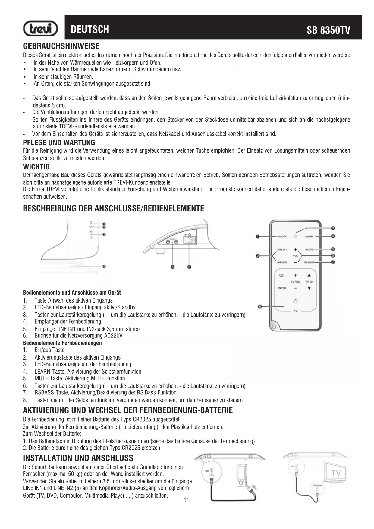 DieSoundBarkannsowohlaufeinerOberflächealsGrundlagefüreinen Fernseher(maximal50kg)oderanderWandinstalliertwerden. VerwendenSieeinKabelmiteinem3,5mmKlinkensteckerumdieEingänge LINEIN1undLINEIN2(5)andenKopfhörer/Audio-Ausgangvonjeglichem Gerät(TV,DVD,Computer,Multimedia-Player....)anzuschließen.12 SB 8350TV
