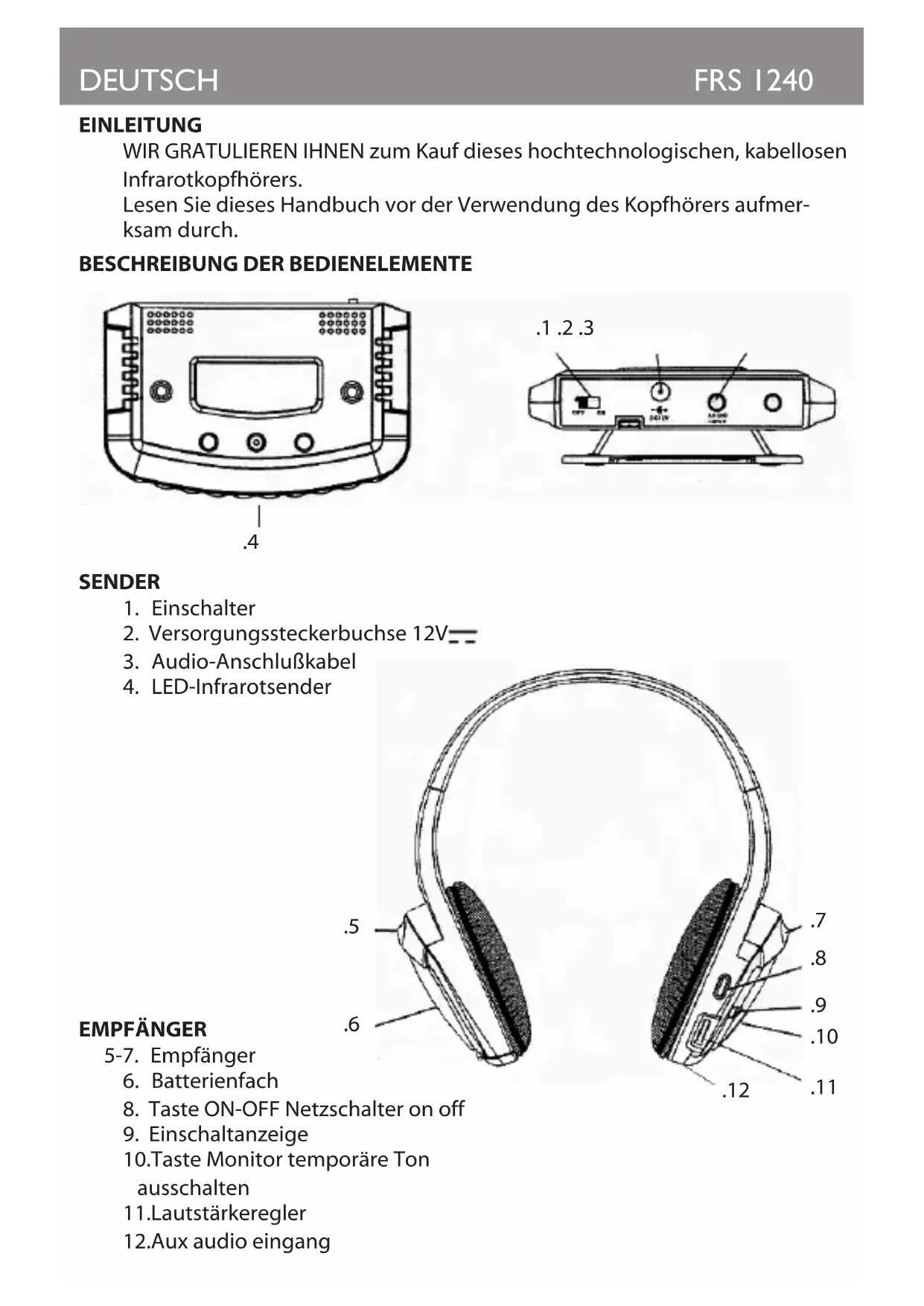 Der Zeichnung ist die ungefähre Reichweite des Infrarotsenders zu ent- nehmen. Die Hörposition muß sich im angegebenen Bereich benden. Die Infrarotstrahlen dringen nicht durch Wände oder matte Glasscheiben. Der Empfang ist deshalb nur dann möglich, wenn sich zwischen dem Sender und dem Kopfhörer keine Hindernisse benden. Die von der Sonne sowie von Halogenlampen ausgesandten Infra- rotstrahlungen können das Gerät stören. Dieses sollte daher weder dem Sonnenlicht noch dem Licht von Halogenlampen direkt ausgesetzt werden. SeitenansichtAnsicht von oben 12 mètres DEUTSCHFRS 1240