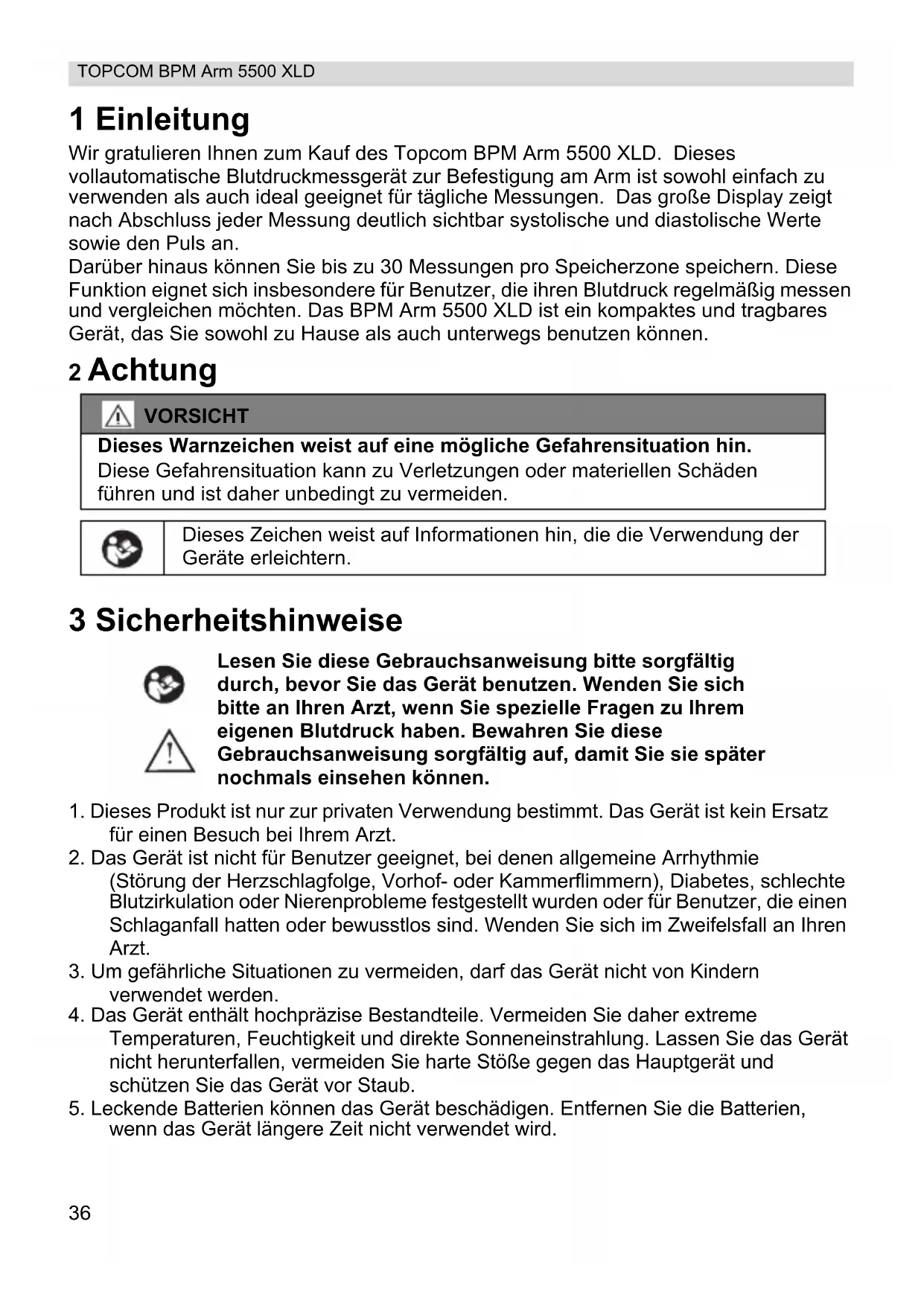 wenn das Gerät längere Zeit nicht verwendet wird. VORSICHT Dieses Warnzeichen weist auf eine mögliche Gefahrensituation hin. Diese Gefahrensituation kann zu Verletzungen oder materiellen Schäden führen und ist daher unbedingt zu vermeiden. Dieses Zeichen weist auf Informationen hin, die die Verwendung der Geräte erleichtern. Lesen Sie diese Gebrauchsanweisung bitte sorgfältig durch, bevor Sie das Gerät benutzen. Wenden Sie sich bitte an Ihren Arzt, wenn Sie spezielle Fragen zu Ihrem eigenen Blutdruck haben. Bewahren Sie diese Gebrauchsanweisung sorgfältig auf, damit Sie sie später nochmals einsehen können.37 DEUTSCH TOPCOM BPM Arm 5500 XLD