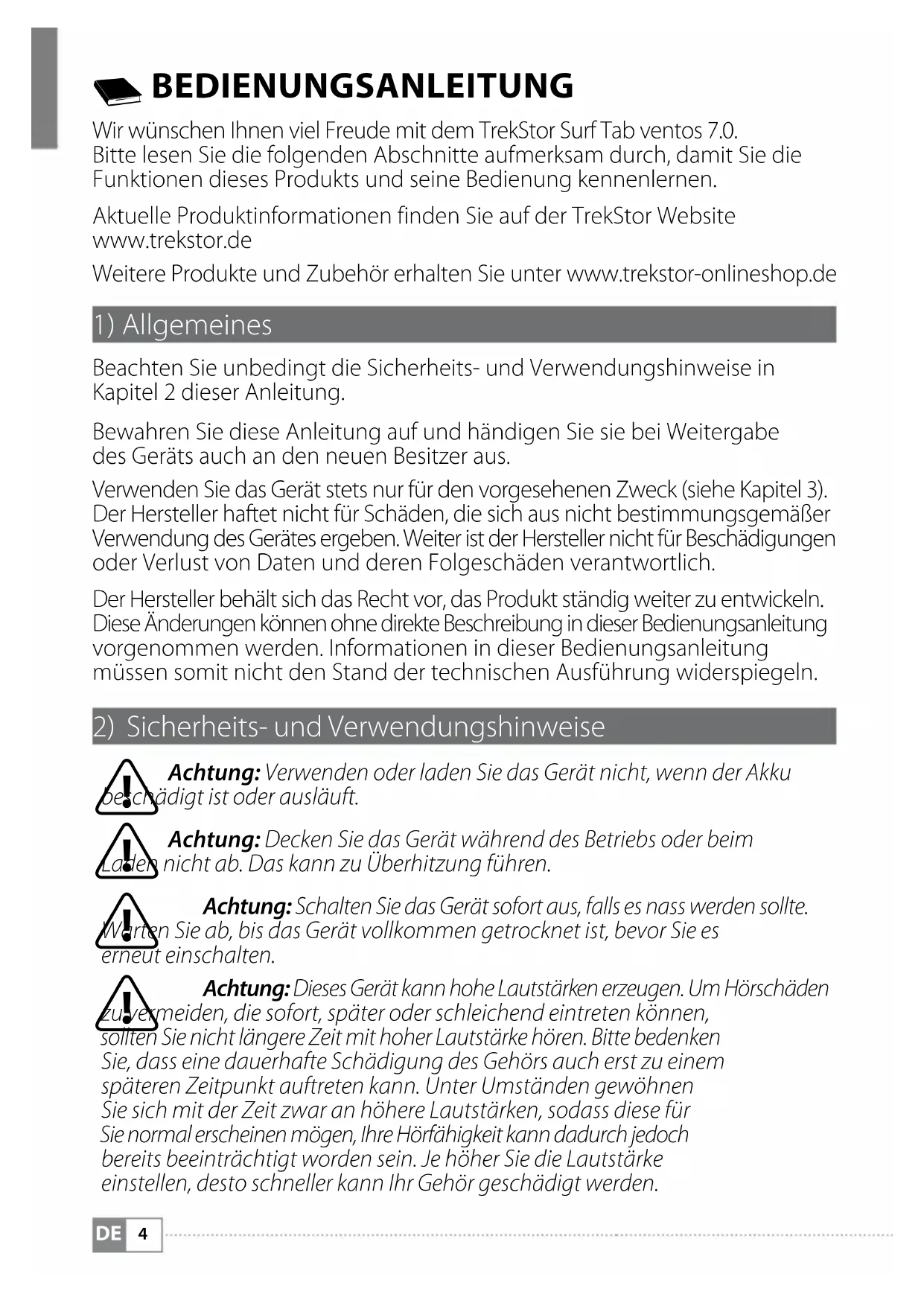 BEDIENUNGSANLEITUNG Wir wünschen Ihnen viel Freude mit dem TrekStor Surf Tab ventos 7.0. Bitte lesen Sie die folgenden Abschnitte aufmerksam durch, damit Sie die Funktionen dieses Produkts und seine Bedienung kennenlernen. Aktuelle Produktinformationen finden Sie auf der TrekStor Website www.trekstor.de Weitere Produkte und Zubehör erhalten Sie unter www.trekstor-onlineshop.de