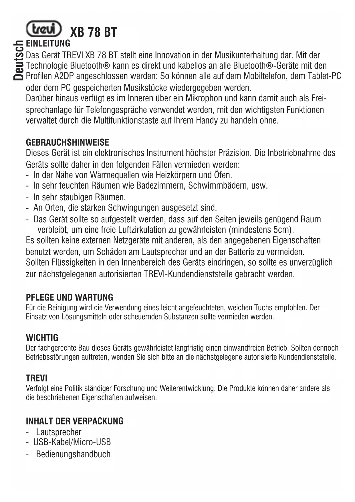 Générales: Batterie rechargeable: Interne au Lithium Temps de Recharge: 4 heures Réponse en fréquence: 100-20000Hz Rapport signal/bruit: > 80dB Facteur de distorsion: < 1.0% Alimentation : DC 5V/500mA Bluetooth®: Norme: 3.0+EDR Prol: A2DP Distance maximum: 9 mètres UTILISATION ADÉQUATE DE LA BATTERIE RECHARGEABLE Recharger la batterie à une température comprise entre 5°C et 35°C. Ne s’étendent pas au-delà de la perception fois indiquée an d’éviter tout risque de surchauffe et d’éclatement. Le chargement au-delà des délais indiqués ou une période d’inactivité prolongée peuvent réduire la durée de vie de la batterie. La batterie rechargeable est soumise à l’usure et sa capacité diminue petit à petit. Pour prolonger la durée de vie de la batterie, l’utiliser lorsqu’elle est complètement rechargée jusqu’au déchargement complet. Ensuite la recharger complètement avant de l’utiliser à nouveau. Lorsqu’une batterie qui n’était pas totalement vide est mise à recharger, sa durée de vie est réduite. Dans ce cas, répétez le cycle de chargement/déchargement complet à plusieurs reprises. FrançaisXB 78 BT EINLEITUNG Das Gerät TREVI XB 78 BT stellt eine Innovation in der Musikunterhaltung dar. Mit der Technologie Bluetooth® kann es direkt und kabellos an alle Bluetooth®-Geräte mit den Prolen A2DP angeschlossen werden: So können alle auf dem Mobiltelefon, dem Tablet-PC oder dem PC gespeicherten Musikstücke wiedergegeben werden. Darüber hinaus verfügt es im Inneren über ein Mikrophon und kann damit auch als Frei- sprechanlage für Telefongespräche verwendet werden, mit den wichtigsten Funktionen verwaltet durch die Multifunktionstaste auf Ihrem Handy zu handeln ohne. GEBRAUCHSHINWEISE Dieses Gerät ist ein elektronisches Instrument höchster Präzision. Die Inbetriebnahme des Geräts sollte daher in den folgenden Fällen vermieden werden: - In der Nähe von Wärmequellen wie Heizkörpern und Öfen. - In sehr feuchten Räumen wie Badezimmern, Schwimmbädern, usw. - In sehr staubigen Räumen. - An Orten, die starken Schwingungen ausgesetzt sind. - Das Gerät sollte so aufgestellt werden, dass auf den Seiten jeweils genügend Raum verbleibt, um eine freie Luftzirkulation zu gewährleisten (mindestens 5cm). Es sollten keine externen Netzgeräte mit anderen, als den angegebenen Eigenschaften benutzt werden, um Schäden am Lautsprecher und an der Batterie zu vermeiden. Sollten Flüssigkeiten in den Innenbereich des Geräts eindringen, so sollte es unverzüglich zur nächstgelegenen autorisierten TREVI-Kundendienststelle gebracht werden.