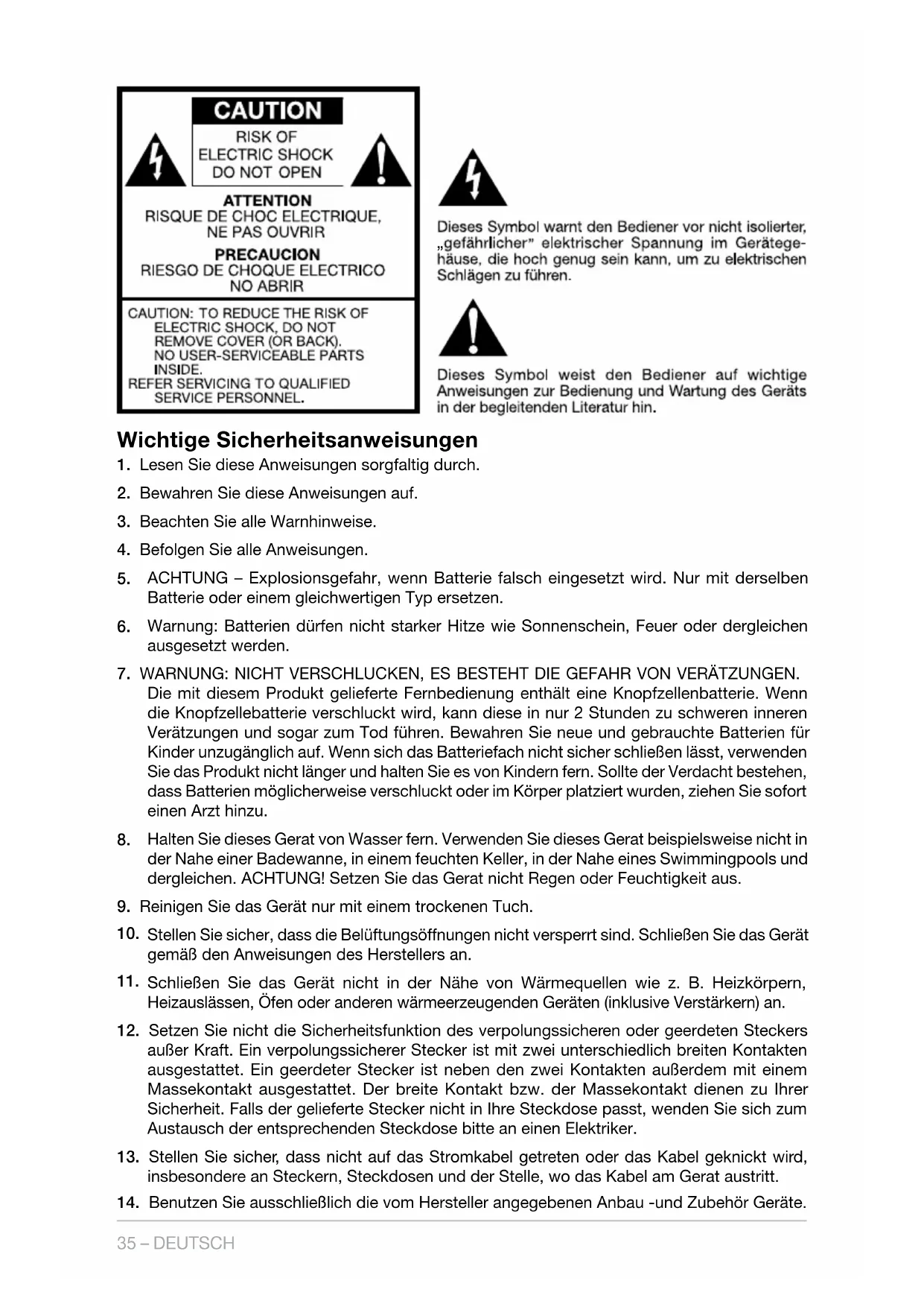 Halten Sie dieses Gerat von Wasser fern. Verwenden Sie dieses Gerat beispielsweise nicht in der Nahe einer Badewanne, in einem feuchten Keller, in der Nahe eines Swimmingpools und dergleichen. ACHTUNG! Setzen Sie das Gerat nicht Regen oder Feuchtigkeit aus.
