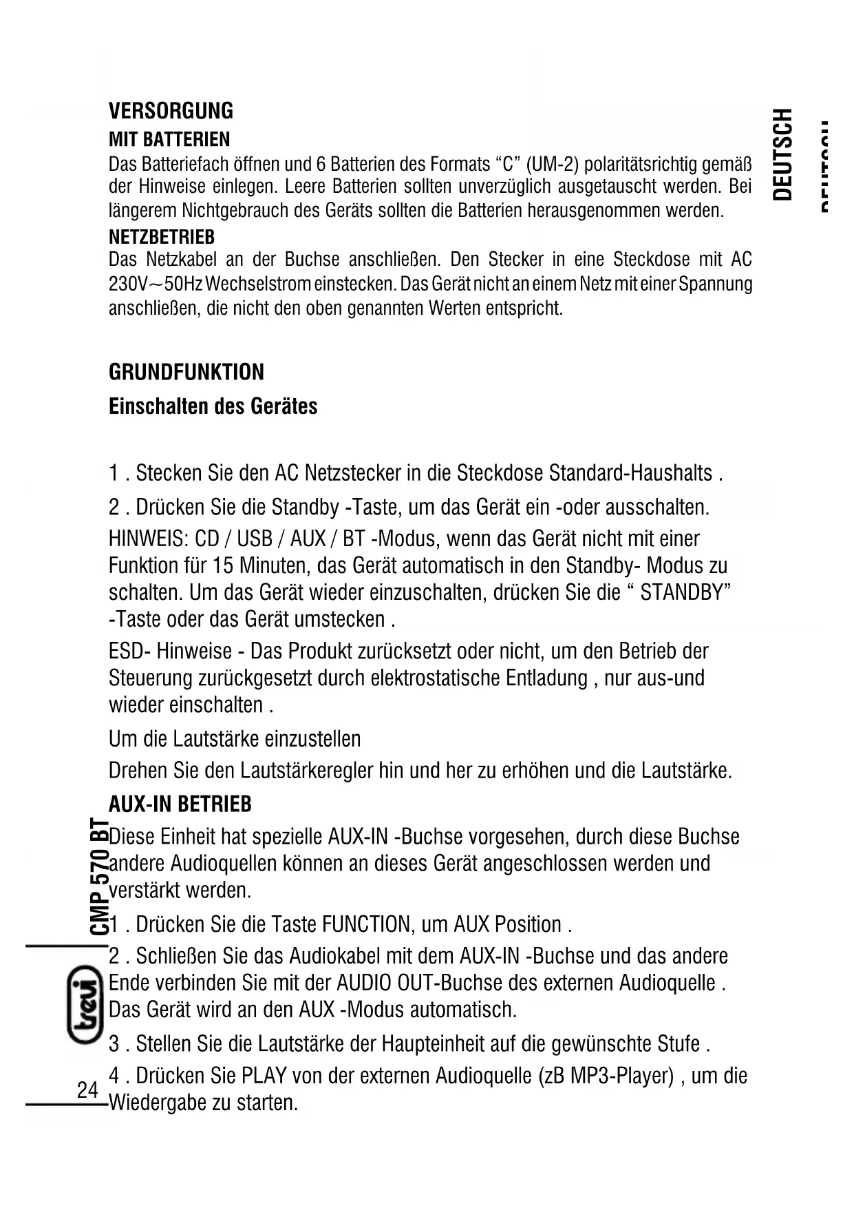 VERSORGUNG MIT BATTERIEN Das Batteriefach öffnen und 6 Batterien des Formats “C” (UM-2) polaritätsrichtig gemäß der Hinweise einlegen. Leere Batterien sollten unverzüglich ausgetauscht werden. Bei längerem Nichtgebrauch des Geräts sollten die Batterien herausgenommen werden. NETZBETRIEB Das Netzkabel an der Buchse anschließen. Den Stecker in eine Steckdose mit AC 230V~50Hz Wechselstrom einstecken. Das Gerät nicht an einem Netz mit einer Spannung anschließen, die nicht den oben genannten Werten entspricht. GRUNDFUNKTION Einschalten des Gerätes 1 . Stecken Sie den AC Netzstecker in die Steckdose Standard-Haushalts . 2 . Drücken Sie die Standby -Taste, um das Gerät ein -oder ausschalten. HINWEIS: CD / USB / AUX / BT -Modus, wenn das Gerät nicht mit einer Funktion für 15 Minuten, das Gerät automatisch in den Standby- Modus zu schalten. Um das Gerät wieder einzuschalten, drücken Sie die “ STANDBY” -Taste oder das Gerät umstecken . ESD- Hinweise - Das Produkt zurücksetzt oder nicht, um den Betrieb der Steuerung zurückgesetzt durch elektrostatische Entladung , nur aus-und wieder einschalten . Um die Lautstärke einzustellen Drehen Sie den Lautstärkeregler hin und her zu erhöhen und die Lautstärke. AUX-IN BETRIEB Diese Einheit hat spezielle AUX-IN -Buchse vorgesehen, durch diese Buchse andere Audioquellen können an dieses Gerät angeschlossen werden und verstärkt werden. 1 . Drücken Sie die Taste FUNCTION, um AUX Position . 2 . Schließen Sie das Audiokabel mit dem AUX-IN -Buchse und das andere Ende verbinden Sie mit der AUDIO OUT-Buchse des externen Audioquelle . Das Gerät wird an den AUX -Modus automatisch. 3 . Stellen Sie die Lautstärke der Haupteinheit auf die gewünschte Stufe . 4 . Drücken Sie PLAY von der externen Audioquelle (zB MP3-Player) , um die Wiedergabe zu starten. DEUTSCH DEUTSCHCMP 570 BT