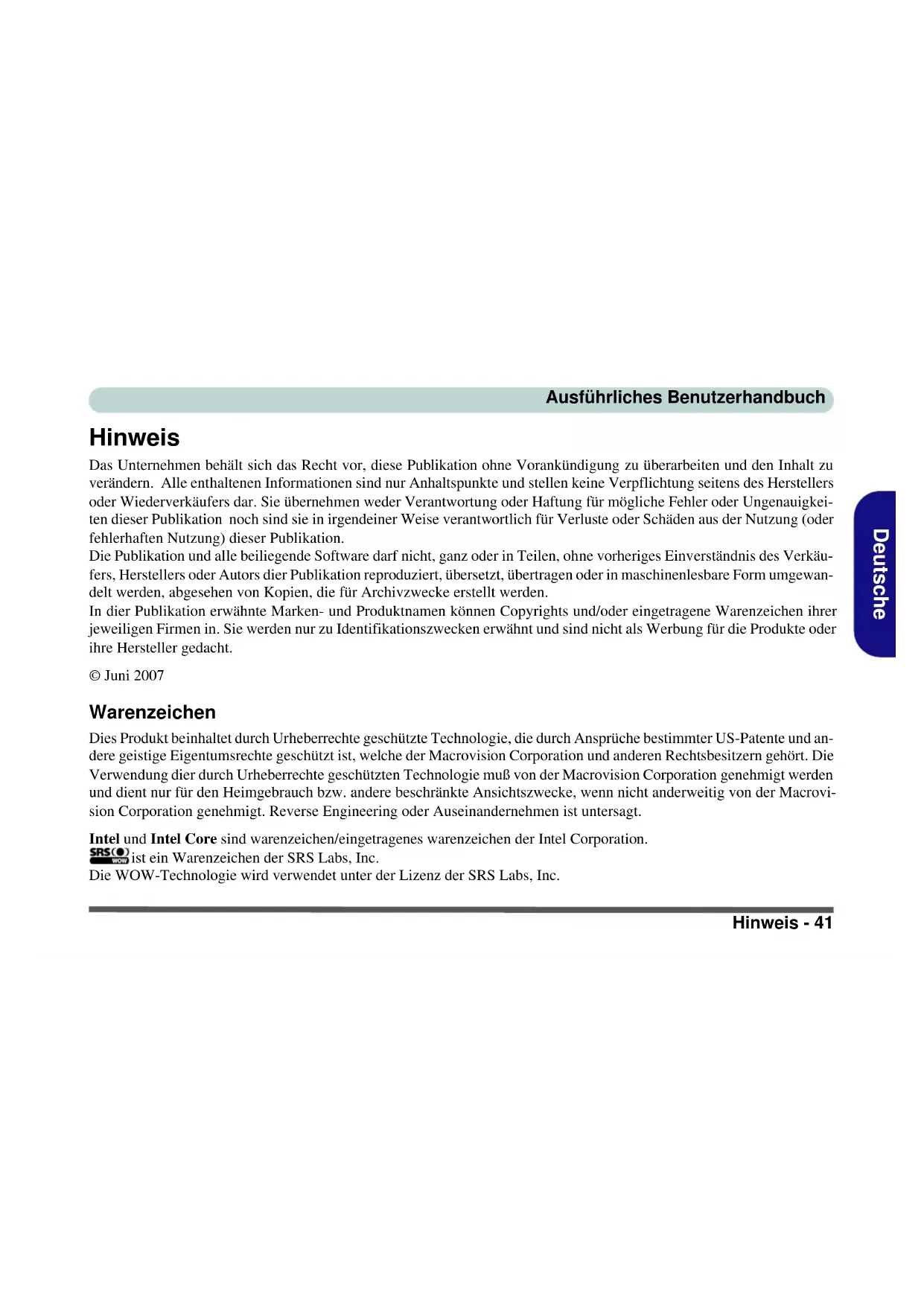 One Sub Woofer (2W, 8Ω) Keyboard & Pointing Device Full Size Winkey Keyboard with Numeric Keypad Built-In TouchPad (Scroll Functionality Included) ExpressCard Slot ExpressCard/34/54 Slot Feature Specification M570RU Concise UG Vista.book Page 38 Monday, November 5, 2007 9:46 AMSpecifications - 39 Concise User’s Guide English I/O Ports Four USB 2.0 Ports One DVI-Out Port (Supports Dual Link) One Headphone/Speaker-Out Jack One Microphone-In Jack One S/PDIF Out Jack One Line-In Jack for Audio Input One Serial Port One Mini-IEEE1394 Port One Infrared Transceiver One RJ-11 Modem Jack One RJ-45 Giga LAN Jack One DC-In Jack One 7-Pin S-Video-Out Jack for TV & HDTV Output One Cable (CATV) Antenna (Analog/Digital) Jack (Functions with Optional TV Tuner Module) One Consumer Infrared Transceiver (Functions with Optional TV Tuner Module) Communication Built-In 56K MDC Modem with V.90 & V.92 Compliant Built-In Gigabit Ethernet LAN Intel® Wireless Wi-Fi Link 4965AGN with MiniCard, PCIe Interface (Option) Mini-PCI TV Tuner Module (Factory Option) Bluetooth 2.0 + EDR (Enhanced Data Rate) Module (Factory Option) 1.3M Pixel USB PC Camera Module (Factory Option) Power Management Supports ACPI 3.0 Supports Resume from Modem Ring Supports Wake on LAN Power Full Range AC/DC Adapter – AC in 100 - 240V, 50 - 60Hz, DC Output 20V, 6.0A (120 Watts) Easy Changeable 8-Cell Smart Lithium-Ion 4400mAH Battery Feature Specification M570RU Concise UG Vista.book Page 39 Monday, November 5, 2007 9:46 AM40 - Specifications Concise User’s Guide English Environmental Spec Temperature Operating: 5°C - 35°C Non-Operating: -20°C - 60°C Relative Humidity Operating: 20% - 80% Non-Operating: 10% - 90% Physical Dimensions & Weight 397mm (w) * 284mm (d) * 22 - 44mm (h) Around 3.95kg (+/- 5%) with 8 Cell Battery Optional Optical Drive Module Options: DVD/CD-RW Combo Drive Module DVD-Super Multi Drive Module Intel® Wireless Wi-Fi Link 4965AGN with MiniCard, PCIe Interface Bluetooth 2.0 + EDR (Enhanced Data Rate) Module (Factory Option) 1.3M Pixel USB PC Camera Module (Factory Option) TPM (Trusted Platform Module) V1.2 (Factory Option) Fingerprint Reader Module (Factory Option) Mini-PCI TV Tuner Module (Factory Option) Feature Specification M570RU Concise UG Vista.book Page 40 Monday, November 5, 2007 9:46 AMHinweis - 41 Ausführliches Benutzerhandbuch Deutsche Hinweis Das Unternehmen behält sich das Recht vor, diese Publikation ohne Vorankündigung zu überarbeiten und den Inhalt zu verändern. Alle enthaltenen Informationen sind nur Anhaltspunkte und stellen keine Verpflichtung seitens des Herstellers oder Wiederverkäufers dar. Sie übernehmen weder Verantwortung oder Haftung für mögliche Fehler oder Ungenauigkei- ten dieser Publikation noch sind sie in irgendeiner Weise verantwortlich für Verluste oder Schäden aus der Nutzung (oder fehlerhaften Nutzung) dieser Publikation. Die Publikation und alle beiliegende Software darf nicht, ganz oder in Teilen, ohne vorheriges Einverständnis des Verkäu- fers, Herstellers oder Autors dier Publikation reproduziert, übersetzt, übertragen oder in maschinenlesbare Form umgewan- delt werden, abgesehen von Kopien, die für Archivzwecke erstellt werden. In dier Publikation erwähnte Marken- und Produktnamen können Copyrights und/oder eingetragene Warenzeichen ihrer jeweiligen Firmen in. Sie werden nur zu Identifikationszwecken erwähnt und sind nicht als Werbung für die Produkte oder ihre Hersteller gedacht. © Juni 2007 Warenzeichen Dies Produkt beinhaltet durch Urheberrechte geschützte Technologie, die durch Ansprüche bestimmter US-Patente und an- dere geistige Eigentumsrechte geschützt ist, welche der Macrovision Corporation und anderen Rechtsbesitzern gehört. Die Verwendung dier durch Urheberrechte geschützten Technologie muß von der Macrovision Corporation genehmigt werden und dient nur für den Heimgebrauch bzw. andere beschränkte Ansichtszwecke, wenn nicht anderweitig von der Macrovi- sion Corporation genehmigt. Reverse Engineering oder Auseinandernehmen ist untersagt. Intel und Intel Core sind warenzeichen/eingetragenes warenzeichen der Intel Corporation. ist ein Warenzeichen der SRS Labs, Inc. Die WOW-Technologie wird verwendet unter der Lizenz der SRS Labs, Inc. M570RU Concise UG Vista.book Page 41 Monday, November 5, 2007 9:46 AM42 - Über das Ausführliche Benutzerhandbuch Ausführliches Benutzerhandbuch Deutsche Über das Ausführliche Benutzerhandbuch Diese Kurzanleitung soll einen Überblick über die Schritte geben, die dazu notwendig sind, das System zu starten. Dieses ist nur eine Ergänzung und kein Ersatz für das erweiterte englischsprachige Benutzerhandbuch, das auf der mitgelieferten CD-ROM Device Drivers & Utilities + User's Manual im Adobe-Acrobat-Format vorliegt. Diese CD-ROM enthält auch die Treiber und Utility-Programme, die für einen einwandfreien Betrieb des Notebooks notwendig sind. Einige oder alle Funktionen des Notebooks sind bereits eingerichtet worden. Falls das nicht der Fall ist oder wenn Sie ein- zelne Teile des Systems neu konfigurieren (oder neu installieren) möchten, finden Sie eine Anleitung im erweiterten Be- nutzerhandbuch. Die CD-ROM Device Drivers & Utilities + User's Manual enthält nicht das Betriebssystem. Informationen zu gesetzlichen Vorschriften Die Informationen zu gesetzlichen Vorschriften finden Sie im erweiterten Benutzerhandbuch auf der CD-ROM Device Drivers & Utilities + User's Manual.