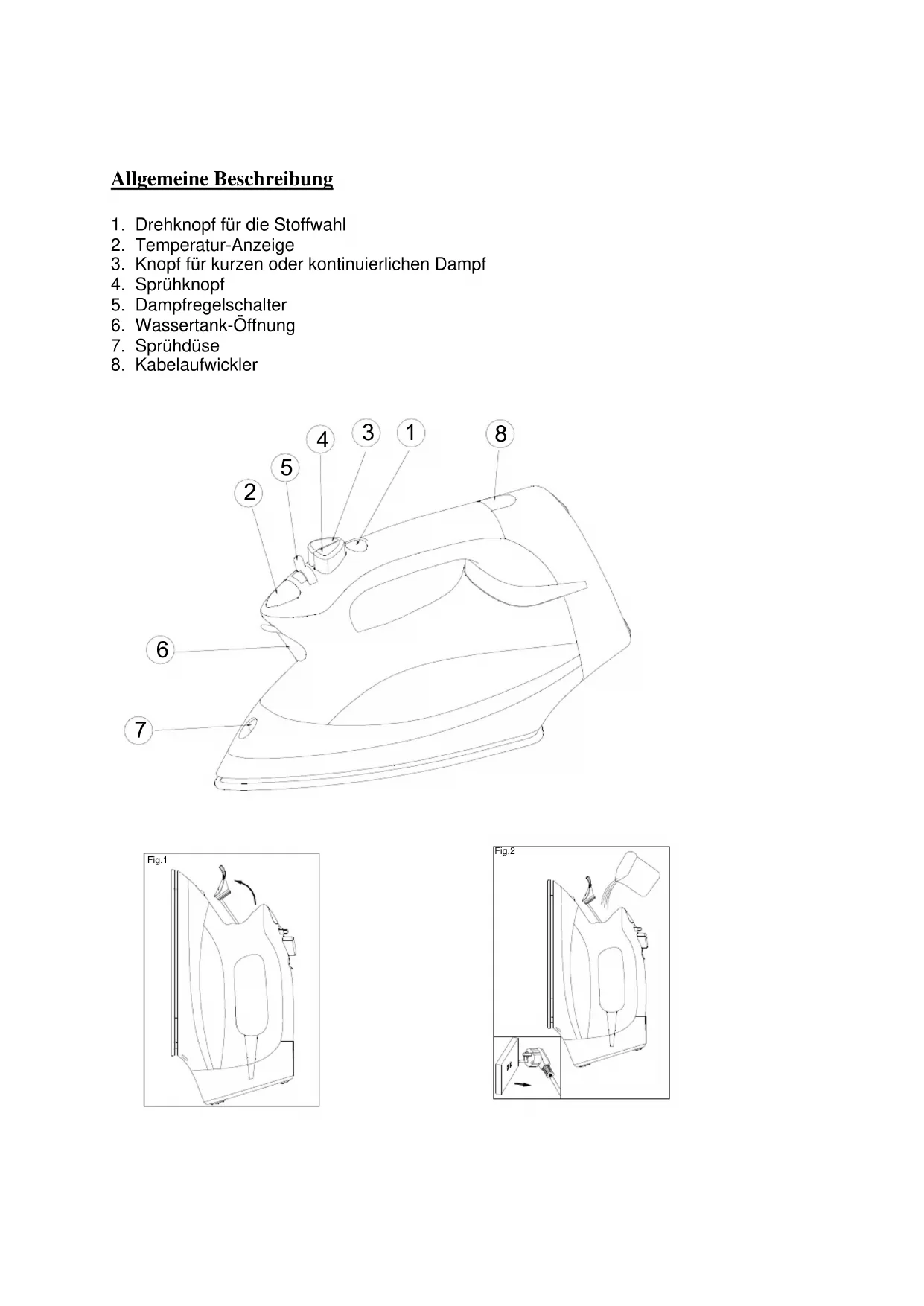 Wichtig! Bitte lesen Sie diese Hinweise vor dem Einsatz des Gerätes durch, und beachten Sie die nachfolgenden Abbildungen während des Gebrauchs. Überprüfen Sie vor dem erstmaligen Einsatz, ob die Spannungsangaben auf dem Gerät mit der tatsächlichen Netzspannung übereinstimmen. Setzen Sie das Gerät niemals ein, wenn dieses in irgend einer Weise beschädigt ist. Stellen Sie sicher, daß Kinder das Bügeleisen nicht berühren können solange dieses heiß ist, und achten Sie darauf, daß Kinder das Bügeleisen nicht am Netzkabel vom Tisch herunter ziehen können. Trennen Sie den Netzstecker von der Wandsteckdose bevor sie Wasser in das Reservoir einfüllen, oder verbleibendes Wasser nach dem Gebrauch ausgießen. Tauchen Sie das Gerät niemals ins Wasser. Beachten Sie die folgenden Hinweise, wenn Sie mit dem Bügeln fertig sind, und bevor Sie das Bügeleisen, auch wenn es nur für kurze Zeit sein sollte, nicht beaufsichtigen: - Bringen Sie den Dampfstrahlregler in die Einstellung für Trockenbügeln.- Stellen Sie das Gerät senkrecht auf. - Trennen Sie den Netzstecker von der Wandsteckdose. Hinweis: Die Bügelsohle kann beschädigt werden, wenn Sie das Gerät mit der Bügelfläche nach unten ausgerichtet verstauen. Einige Bauteile des Bügeleisens wurden etwas eingeölt, und aus diesem Grund kann es zu geringer Rauchentwicklung kommen wenn Sie das Gerät erstmals einschalten. Die Rauchentwicklung hört jedoch nach kurzer Zeit auf. Vor dem ersten Einsatz sollten Sie Aufkleber und Schutzfolien von der Bügelsohle mittels eines weichen Tuchs entfernen. Geben Sie niemals Essig oder Entkalker in den Wassertank Verwenden Sie niemals chemisch entkalktes Wasser. Lassen Sie das Netzkabel niemals mit der heißen Bügelsohle in Berührung kommen. Versuchen Sie niemals das Bügeleisen, den Netzstecker oder das Netzkabel selbst zu reparieren. Lassen Sie das Bügeleisen während des Betriebs niemals unbeaufsichtigt Wenn das Netzkabel beschädigt ist, muß dieses vom Hersteller, von einem vom Hersteller beauftragten Service-Betrieb, oder von einem Elektrofachmann ausgewechselt werden, um eventuelle Gefahren durch Stromschlag oder Feuer zu vermeiden. Das Bügeleisen muss bei Verwendung auf einer stabilen Unterlage abgestellt werden. Wenn Sie das Bügeleisen auf seinen Standplatz stellen, stellen Sie sicher, dass die Oberfläche auf dem der Ständer (Bügelbrett) plaziert ist, stabil ist. Das Bügeleisen sollte nicht verwendet werden, wenn es fallengelassen worden ist und wenn es sichtbare Zeichen des Schadens gibt oder wenn es leckt (undicht ist). Kinder können Gefahren, die von elektrischen Geräten ausgehen, nicht richtig einschätzen. Lassen Sie Kinder nicht ohne Aufsicht elektrische Geräte benutzen Das Bügeleisen darf nicht unbeaufsichtigt bleiben, während es am Netz angeschlossen ist. Alt-Elelktrogeräte sind Wertstoffe, sie gehören daher nicht in den Hausmüll. Wir möchten Sie daher bitten, uns mit Ihrem aktiven Beitrag bei der Ressourcenschonung und beim Umweltschutz zu unterstützen und dieses Gerät bei den –falls vorhanden- eingerichteten Rücknahmestellen abzugeben Wassertank auffüllen (für Dampfbügeln und Sprühen) Füllen Sie das Gerät für den erstmaligen Einsatz mit Leitungswasser. Sie können auch weiterhin Leitungswasser verwenden. Wenn das Wasser in Ihrem Versorgungsgebiet jedoch sehr hart ist (d.h. Härtegrad über 17°dH) empfehlen wir Ihnen destilliertes Wasser zu verwenden. Bevor Sie Wasser einfüllen, bitte den Stecker aus der Steckdose ziehen. Den Dampfregelschalter (5) auf „no steam“ (kein Dampf) einstellen. Den Deckel des Wassertanks öffnen (Abb. 1). Benutzen Sie bitte den beigefügten Messbecher um Wasser einzufüllen (Abb. 2). Einstellen der Bügeltemperatur (Abb. 8)