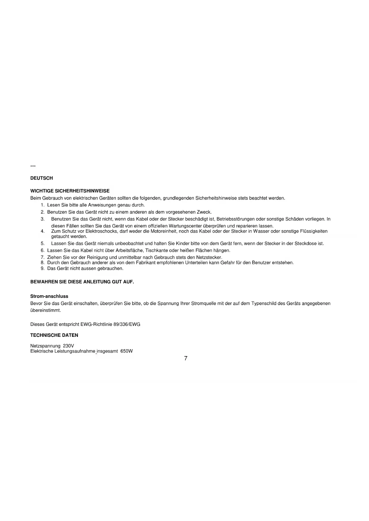 Dieses Gerät entspricht EWG-Richtlinie 89/336/EWG TECHNISCHE DATEN Netzspannung 230V Elektrische Leistungsaufnahme insgesamt 650W8
