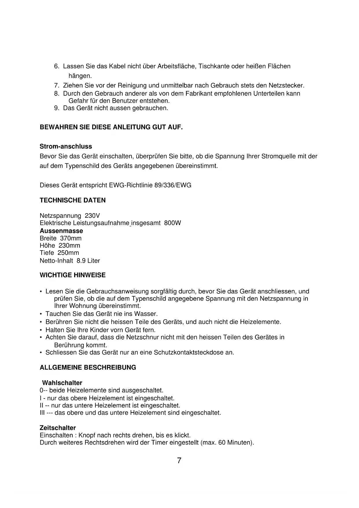 Dieses Gerät entspricht EWG-Richtlinie 89/336/EWG TECHNISCHE DATEN Netzspannung 230V Elektrische Leistungsaufnahme insgesamt 800W Aussenmasse