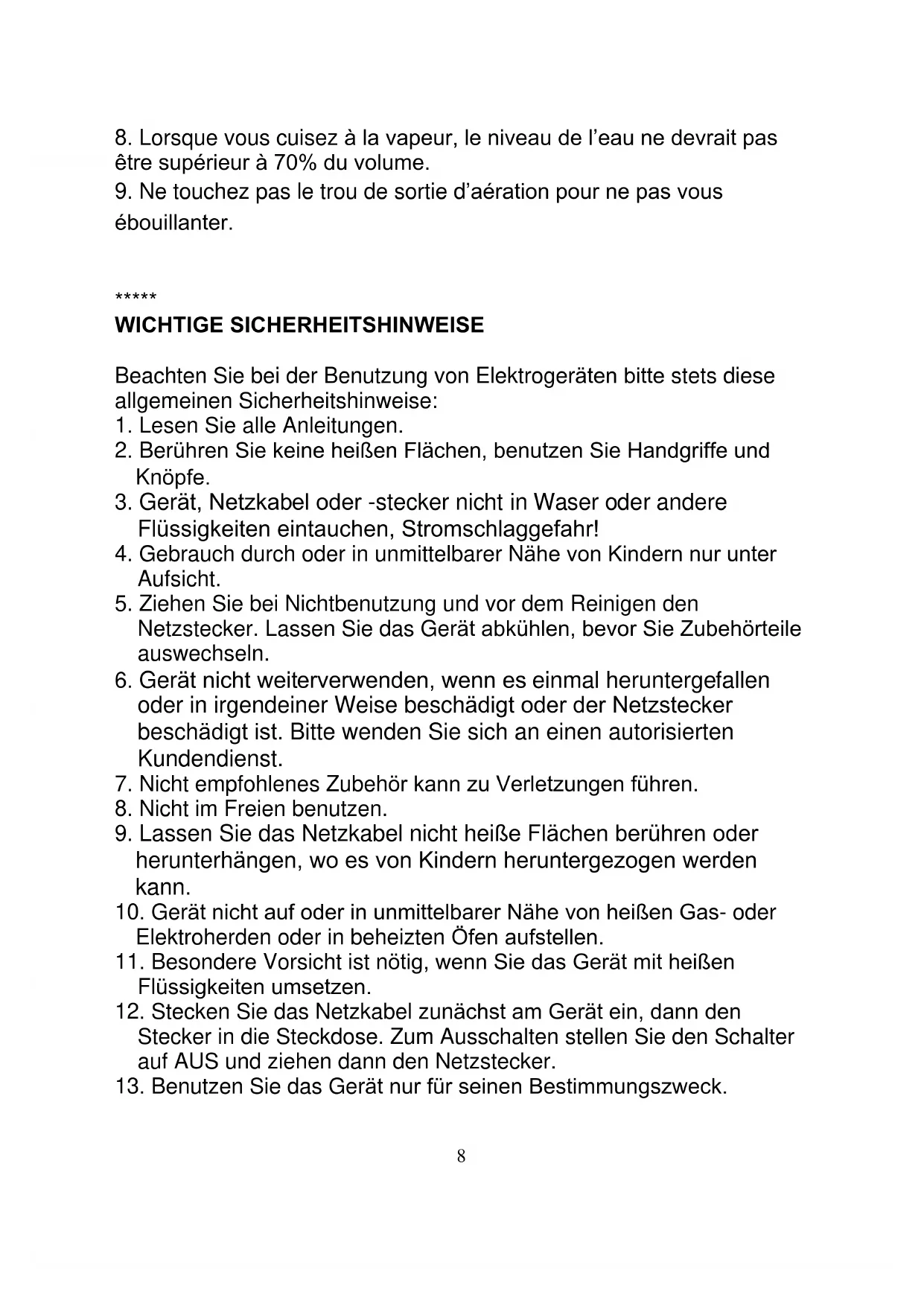 WICHTIGE SICHERHEITSHINWEISE Beachten Sie bei der Benutzung von Elektrogeräten bitte stets diese allgemeinen Sicherheitshinweise: