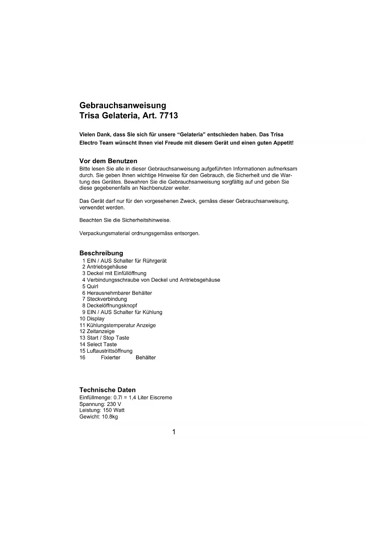 9Gebrauchsanweisung Trisa Gelateria, Art. 7713 Vielen Dank, dass Sie sich für unsere “Gelateria” entschieden haben. Das Trisa Electro Team wünscht Ihnen viel Freude mit diesem Gerät und einen guten Appetit! Vor dem Benutzen Bitte lesen Sie alle in dieser Gebrauchsanweisung aufgeführten Informationen aufmerksam durch. Sie geben Ihnen wichtige Hinweise für den Gebrauch, die Sicherheit und die War- tung des Gerätes. Bewahren Sie die Gebrauchsanweisung sorgfältig auf und geben Sie diese gegebenenfalls an Nachbenutzer weiter. Das Gerät darf nur für den vorgesehenen Zweck, gemäss dieser Gebrauchsanweisung, verwendet werden. Beachten Sie die Sicherheitshinweise. Verpackungsmaterial ordnungsgemäss entsorgen. Beschreibung 1 EIN / AUS Schalter für Rührgerät 2 Antriebsgehäuse 3 Deckel mit Einfüllöffnung 4 Verbindungsschraube von Deckel und Antriebsgehäuse 5 Quirl 6 Herausnehmbarer Behälter 7 Steckverbindung 8 Deckelöffnungsknopf 9 EIN / AUS Schalter für Kühlung 10 Display 11 Kühlungstemperatur Anzeige 12 Zeitanzeige 13 Start / Stop Taste 14 Select Taste 15 Luftaustrittsöffnung 16 Fixierter Behälter Technische Daten Einfüllmenge: 0.7l = 1,4 Liter Eiscreme Spannung: 230 V Leistung: 150 Watt Gewicht: 10.8kg 1Vor dem Erstgebrauch Prüfen Sie bereits beim Auspacken des Gerätes ob alle Zubehörteile gemäss dieser Gebrauchsanweisung enthalten sind und das Gerät keine Schäden aufweist. Sauberkeit und Hygiene ist sehr wichtig bei der Verarbeitung von Lebensmitteln. Spülen Sie alle Teile die mit der Eiscreme in Berührung kommen (Edelstahl- Alubehälter, Quirl und Deckel) und trocknen alles sorgfältig ab. Achtung! Während des Transports ist das Gerät möglicherweise umgekippt oder auf den Kopf gestellt worden. Dies kann bewirken, dass die Kühlflüssigkeit im Kreislauf verteilt ist und dem Kompressor nicht zur Verfügung steht. Stellen Sie das Gerät 12 Stunden auf eine waagrechte Fläche, so dass sich die Kühlflüssigkeit wieder sammelt. Auch wenn in der Folgezeit sich das Gerät in fal- scher Lage befindet, diesen Vorgang wiederholen. Erste Inbetriebnahme Den Stecker ans Stromnetz anschliessen. (Nur an Wechselstrom mit Spannung von 230 Volt). Stellen Sie das Gerät immer auf eine stabile, waagrechte Oberfläche. Die Lüftungsöffnungen auf der Vorder- und Rückseite dürfen nicht abgedeckt sein. Halten Sie einen Abstand von 20cm ein. Anwendung Achtung - Bitte benützen Sie bei der Zubereitung von Eiscreme immer frische und einwand- freie Zutaten. - Die Früchte müssen immer frisch und gewaschen sein. - Die Zutaten sollten bei der Verarbeitung möglichst vorgekühlt sein. - Nie heisse Zutaten in die Maschine füllen!