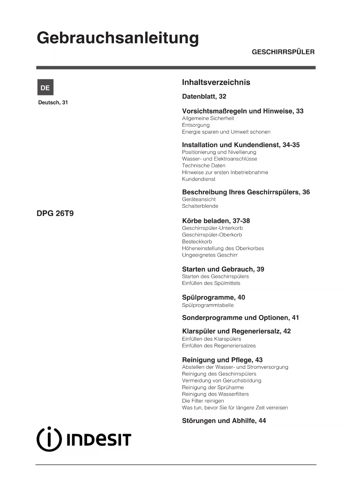 DPG 26T9 - Geschirrspüler INDESIT - Kostenlose Bedienungsanleitung