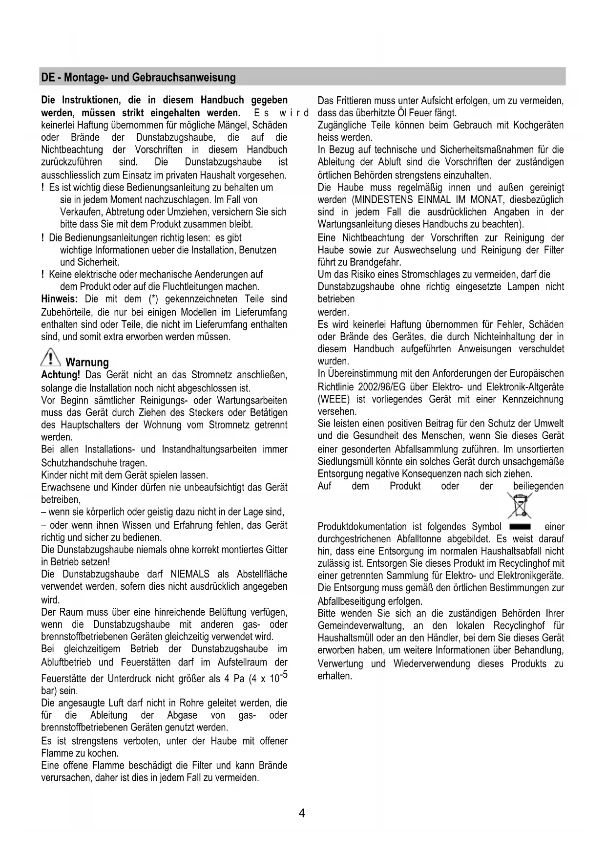 SL Navodila za montažo in uporabo UK Інструкція з монтажу і експлуатації TR Montaj ve kullanım talimatları ET Paigaldus- ja kasutusjuhend LT montavimo ir naudojimosi instrukcija LV ierīkošanas un izmantošanas instrukcija HR Uputstva za montažu i za uporabu SR Uputstva za montažu i upotrebu AR لﺎﻤﻌﺘﺳﻻاو ﺐﻴآﺮﺘﻟا قﺮﻃ4 DE - Montage- und Gebrauchsanweisung Die Instruktionen, die in diesem Handbuch gegeben werden, müssen strikt eingehalten werden. Es wird keinerlei Haftung übernommen für mögliche Mängel, Schäden oder Brände der Dunstabzugshaube, die auf die Nichtbeachtung der Vorschriften in diesem Handbuch zurückzuführen sind. Die Dunstabzugshaube ist ausschliesslich zum Einsatz im privaten Haushalt vorgesehen. ! Es ist wichtig diese Bedienungsanleitung zu behalten um sie in jedem Moment nachzuschlagen. Im Fall von Verkaufen, Abtretung oder Umziehen, versichern Sie sich bitte dass Sie mit dem Produkt zusammen bleibt. ! Die Bedienungsanleitungen richtig lesen: es gibt wichtige Informationen ueber die Installation, Benutzen und Sicherheit. ! Keine elektrische oder mechanische Aenderungen auf dem Produkt oder auf die Fluchtleitungen machen. Hinweis: Die mit dem (*) gekennzeichneten Teile sind Zubehörteile, die nur bei einigen Modellen im Lieferumfang enthalten sind oder Teile, die nicht im Lieferumfang enthalten sind, und somit extra erworben werden müssen. Warnung Achtung! Das Gerät nicht an das Stromnetz anschließen, solange die Installation noch nicht abgeschlossen ist. Vor Beginn sämtlicher Reinigungs- oder Wartungsarbeiten muss das Gerät durch Ziehen des Steckers oder Betätigen des Hauptschalters der Wohnung vom Stromnetz getrennt werden. Bei allen Installations- und Instandhaltungsarbeiten immer Schutzhandschuhe tragen. Kinder nicht mit dem Gerät spielen lassen. Erwachsene und Kinder dürfen nie unbeaufsichtigt das Gerät betreiben, – wenn sie körperlich oder geistig dazu nicht in der Lage sind, – oder wenn ihnen Wissen und Erfahrung fehlen, das Gerät richtig und sicher zu bedienen. Die Dunstabzugshaube niemals ohne korrekt montiertes Gitter in Betrieb setzen! Die Dunstabzugshaube darf NIEMALS als Abstellfläche verwendet werden, sofern dies nicht ausdrücklich angegeben wird. Der Raum muss über eine hinreichende Belüftung verfügen, wenn die Dunstabzugshaube mit anderen gas- oder brennstoffbetriebenen Geräten gleichzeitig verwendet wird. Bei gleichzeitigem Betrieb der Dunstabzugshaube im Abluftbetrieb und Feuerstätten darf im Aufstellraum der Feuerstätte der Unterdruck nicht größer als 4 Pa (4 x 10