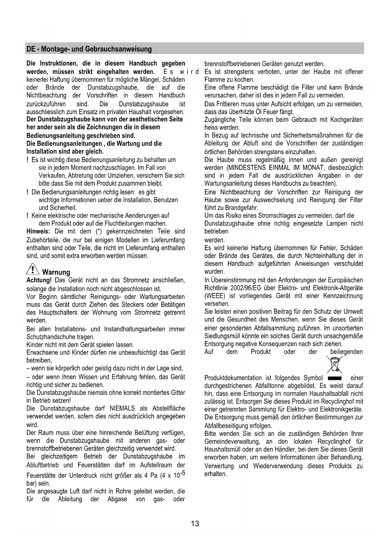 Se l'illuminazione non dovesse funzionare, controllate il corretto inserimento delle lampade nella sede prima di chiamare l'assistenza tecnica.13 DE - Montage- und Gebrauchsanweisung Die Instruktionen, die in diesem Handbuch gegeben werden, müssen strikt eingehalten werden. Es wird keinerlei Haftung übernommen für mögliche Mängel, Schäden oder Brände der Dunstabzugshaube, die auf die Nichtbeachtung der Vorschriften in diesem Handbuch zurückzuführen sind. Die Dunstabzugshaube ist ausschliesslich zum Einsatz im privaten Haushalt vorgesehen. Der Dunstabzugshaube kann von der aesthetischen Seite her ander sein als die Zeichnungen die in diesem Bedienungsanleitung geschrieben sind. Die Bedienungsanleitungen , die Wartung und die Installation sind aber gleich. ! Es ist wichtig diese Bedienungsanleitung zu behalten um sie in jedem Moment nachzuschlagen. Im Fall von Verkaufen, Abtretung oder Umziehen, versichern Sie sich bitte dass Sie mit dem Produkt zusammen bleibt. ! Die Bedienungsanleitungen richtig lesen: es gibt wichtige Informationen ueber die Installation, Benutzen und Sicherheit. ! Keine elektrische oder mechanische Aenderungen auf dem Produkt oder auf die Fluchtleitungen machen. Hinweis: Die mit dem (*) gekennzeichneten Teile sind Zubehörteile, die nur bei einigen Modellen im Lieferumfang enthalten sind oder Teile, die nicht im Lieferumfang enthalten sind, und somit extra erworben werden müssen. Warnung Achtung! Das Gerät nicht an das Stromnetz anschließen, solange die Installation noch nicht abgeschlossen ist. Vor Beginn sämtlicher Reinigungs- oder Wartungsarbeiten muss das Gerät durch Ziehen des Steckers oder Betätigen des Hauptschalters der Wohnung vom Stromnetz getrennt werden. Bei allen Installations- und Instandhaltungsarbeiten immer Schutzhandschuhe tragen. Kinder nicht mit dem Gerät spielen lassen. Erwachsene und Kinder dürfen nie unbeaufsichtigt das Gerät betreiben, – wenn sie körperlich oder geistig dazu nicht in der Lage sind, – oder wenn ihnen Wissen und Erfahrung fehlen, das Gerät richtig und sicher zu bedienen. Die Dunstabzugshaube niemals ohne korrekt montiertes Gitter in Betrieb setzen! Die Dunstabzugshaube darf NIEMALS als Abstellfläche verwendet werden, sofern dies nicht ausdrücklich angegeben wird. Der Raum muss über eine hinreichende Belüftung verfügen, wenn die Dunstabzugshaube mit anderen gas- oder brennstoffbetriebenen Geräten gleichzeitig verwendet wird. Bei gleichzeitigem Betrieb der Dunstabzugshaube im Abluftbetrieb und Feuerstätten darf im Aufstellraum der Feuerstätte der Unterdruck nicht größer als 4 Pa (4 x 10