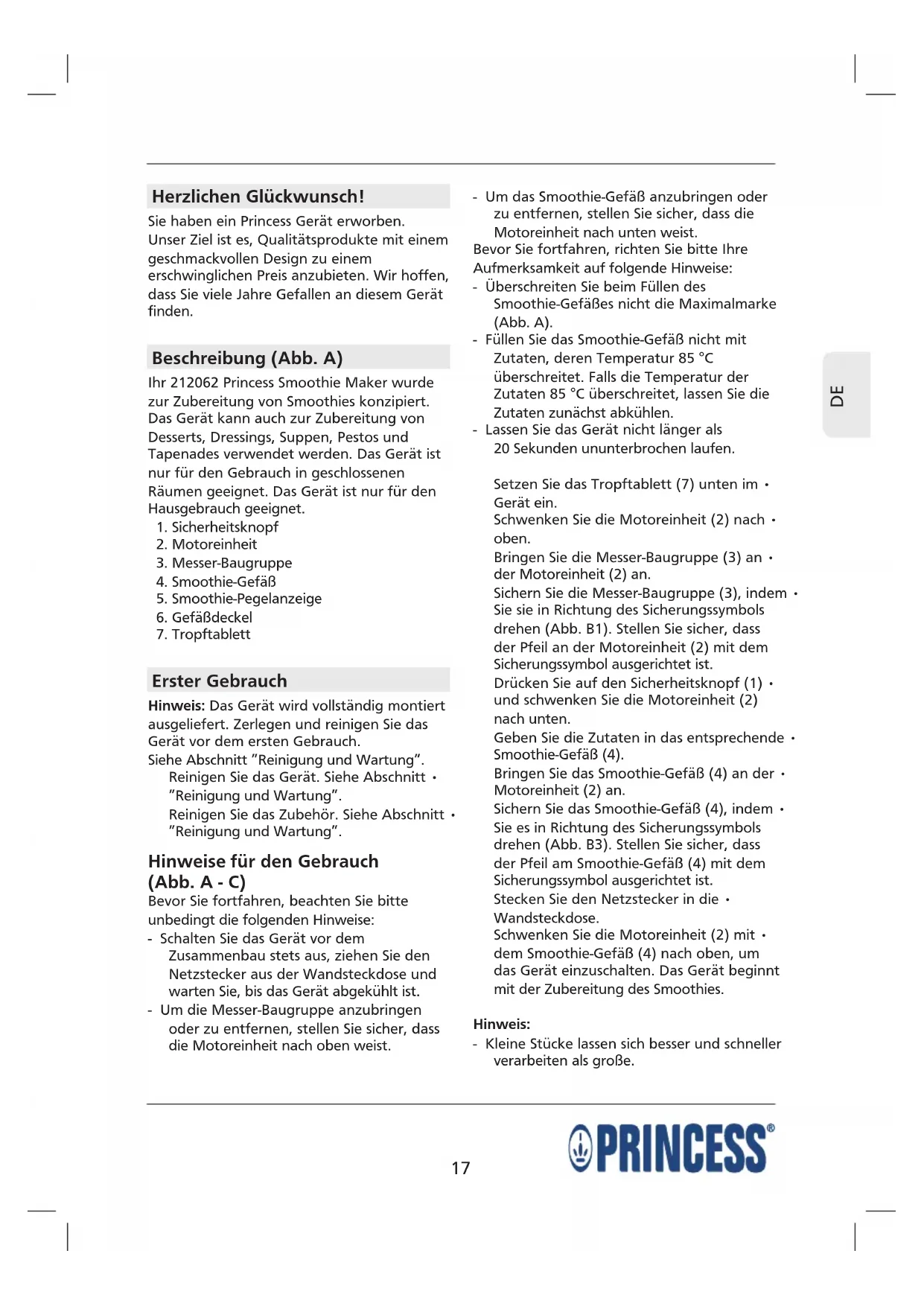 Finden Sie kostenlos die Bedienungsanleitung des Geräts Smoothie Maker 212062 PRINCESS als PDF.
