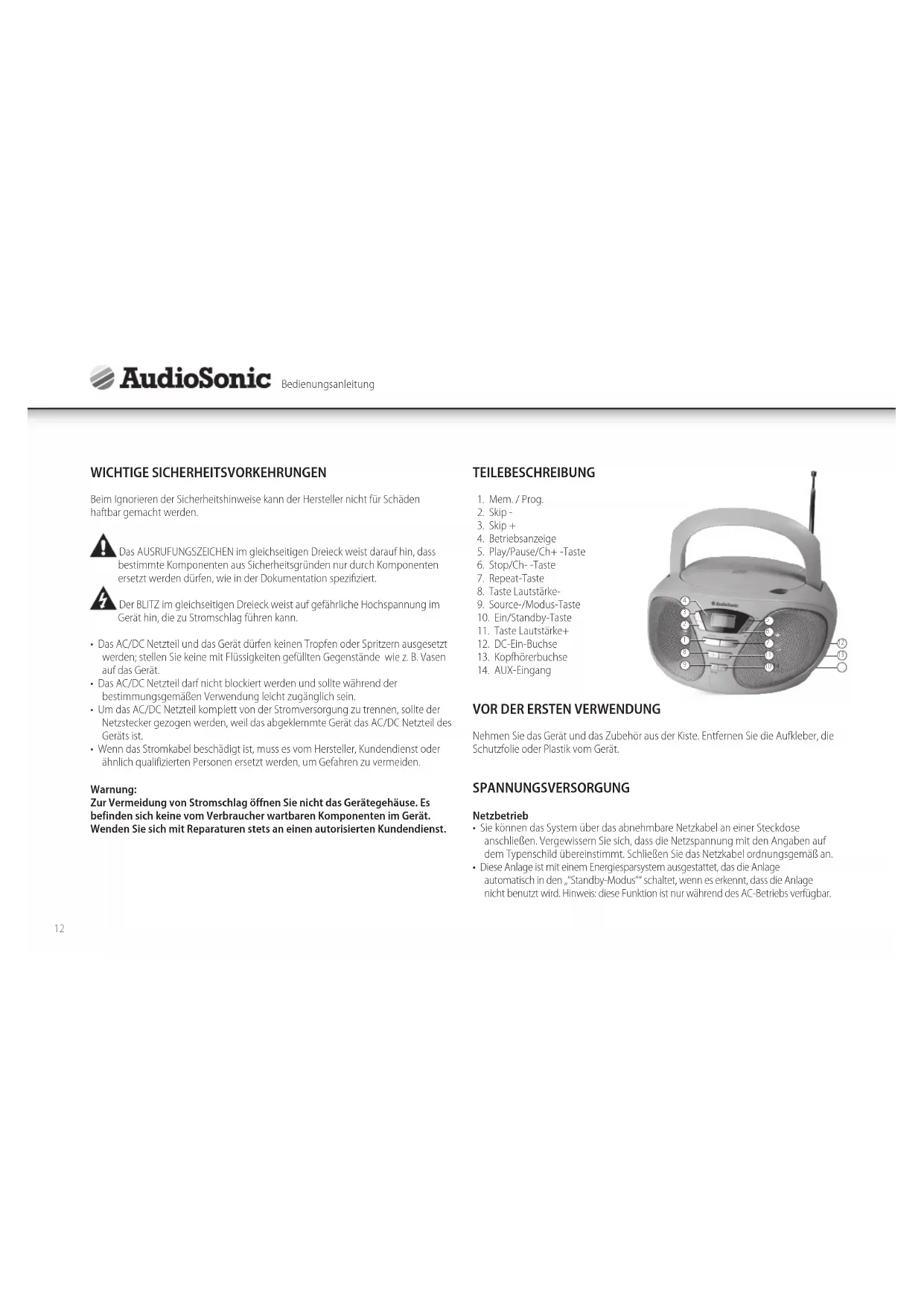 BEDIENUNGSANLEITUNG CD1567 AudioSonic