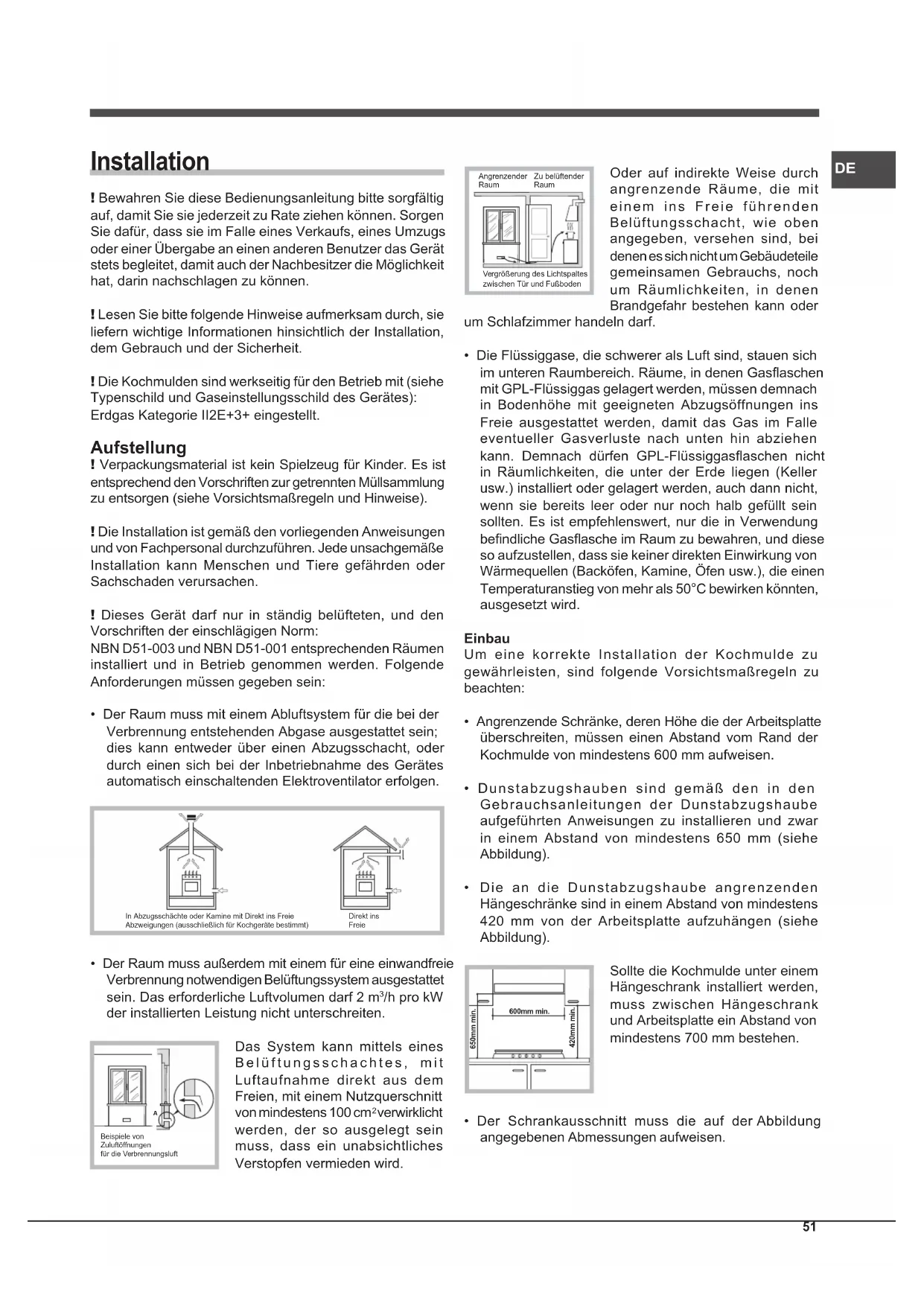 Installation ! Bewahren Sie diese Bedienungsanleitung bitte sorgfältig auf, damit Sie sie jederzeit zu Rate ziehen können. Sorgen Sie dafür, dass sie im Falle eines Verkaufs, eines Umzugs oder einer Übergabe an einen anderen Benutzer das Gerät stets begleitet, damit auch der Nachbesitzer die Möglichkeit hat, darin nachschlagen zu können. ! Lesen Sie bitte folgende Hinweise aufmerksam durch, sie liefern wichtige Informationen hinsichtlich der Installation, dem Gebrauch und der Sicherheit. ! Die Kochmulden sind werkseitig für den Betrieb mit (siehe Typenschild und Gaseinstellungsschild des Gerätes): Erdgas Kategorie II2E+3+ eingestellt. Aufstellung ! Verpackungsmaterial ist kein Spielzeug für Kinder. Es ist entsprechend den Vorschriften zur getrennten Müllsammlung zu entsorgen (siehe Vorsichtsmaßregeln und Hinweise). ! Die Installation ist gemäß den vorliegenden Anweisungen und von Fachpersonal durchzuführen. Jede unsachgemäße Installation kann Menschen und Tiere gefährden oder Sachschaden verursachen. ! Dieses Gerät darf nur in ständig belüfteten, und den Vorschriften der einschlägigen Norm: NBN D51-003 und NBN D51-001 entsprechenden Räumen installiert und in Betrieb genommen werden. Folgende Anforderungen müssen gegeben sein: