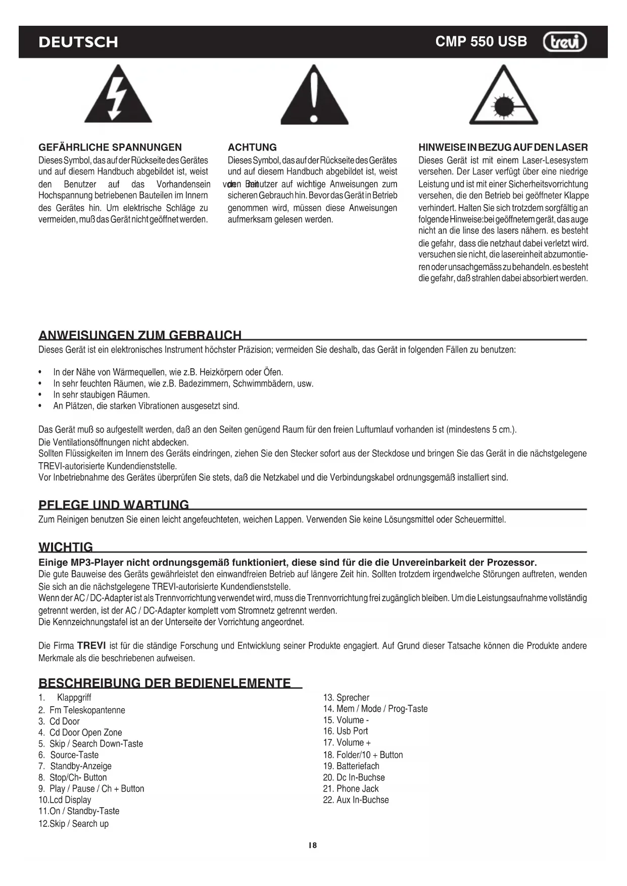 ZumReinigenbenutzenSieeinenleichtangefeuchteten,weichenLappen.VerwendenSiekeineLösungsmitteloderScheuermittel. WICHTIG Einige MP3-Player nicht ordnungsgemäß funktioniert, diese sind für die die Unvereinbarkeit der Prozessor. Die gute Bauweise des Geräts gewährleistet den einwandfreien Betrieb auf längere Zeit hin. Sollten trotzdem irgendwelche Störungen auftreten, wenden SiesichandienächstgelegeneTREVI-autorisierteKundendienststelle. Wenn der AC / DC-Adapter ist als Trennvorrichtung verwendet wird, muss die Trennvorrichtung frei zugänglich bleiben. Um die Leistungsaufnahme vollständig getrennt werden, ist der AC / DC-Adapter komplett vom Stromnetz getrennt werden. DieKennzeichnungstafelistanderUnterseitederVorrichtungangeordnet. Die Firma TREVI ist für die ständige Forschung und Entwicklung seiner Produkte engagiert. Auf Grund dieser Tatsache können die Produkte andere Merkmale als die beschriebenen aufweisen. DEUTSCH
