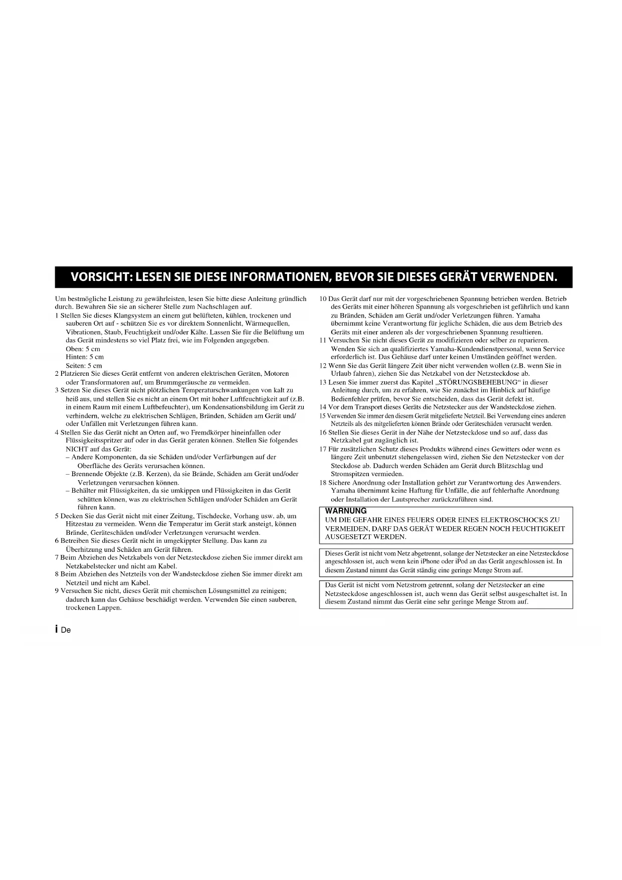 Technische Daten 11 Prüfen Sie vor dem Zusammenbau und Anschluss, ob Sie sämtliche folgende Artikel erhalten haben.•Netzteil × 1• 3,5-mm-Stereo-Ministeckerkabel (2,0 m) × 1Verwenden Sie dieses Gerät nicht in einem Abstand von weniger als 22 cm zu Personen, die ein Herzschrittmacher-oder Defibrillator-Implantat tragen.Funkwellen können elektronische medizinische Geräte stören.Benutzen Sie dieses Gerät nicht in der Nähe von medizinischen Geräten oder Einrichtungen. Vorsichtshinweise Bitte lesen Sie vor dem Gebrauch die folgenden Vorsichtshinweise für den Betrieb:• Verwenden Sie ausschließlich das für dieses Gerät vorgesehene Netzteil. Yamaha übernimmt keine Verantwortung für Schäden, die durch die Verwendung anderer Netzteile verursacht wurden.• Üben Sie keinen Druck oder keine übermäßige Kraft auf die Regler des Geräts aus und stellen Sie keine schweren Gegenstände auf das Gehäuse.• Vermeiden Sie die Ausgabe von Testdisks, elektrischen Musikinstrumenten oder extrem lauter oder verzerrter Eingabe. Dies könnte eine Störung der Lautsprecher verursachen.• Dieses Gerät kann Bildverzerrungen hervorrufen, wenn es in der Nähe eines Computerbildschirms oder Fernsehers aufgestellt wird. Stellen Sie es in diesem Fall weiter entfernt auf.• Halten Sie dieses Gerät von Magnetmedien wie Disketten und Bändern fern. Anderenfalls könnten die Daten auf dem Medium zerstört werden.• Trennen Sie das Netzteil sofort von der Steckdose, wenn ein Problem auftreten sollte. Inhalt