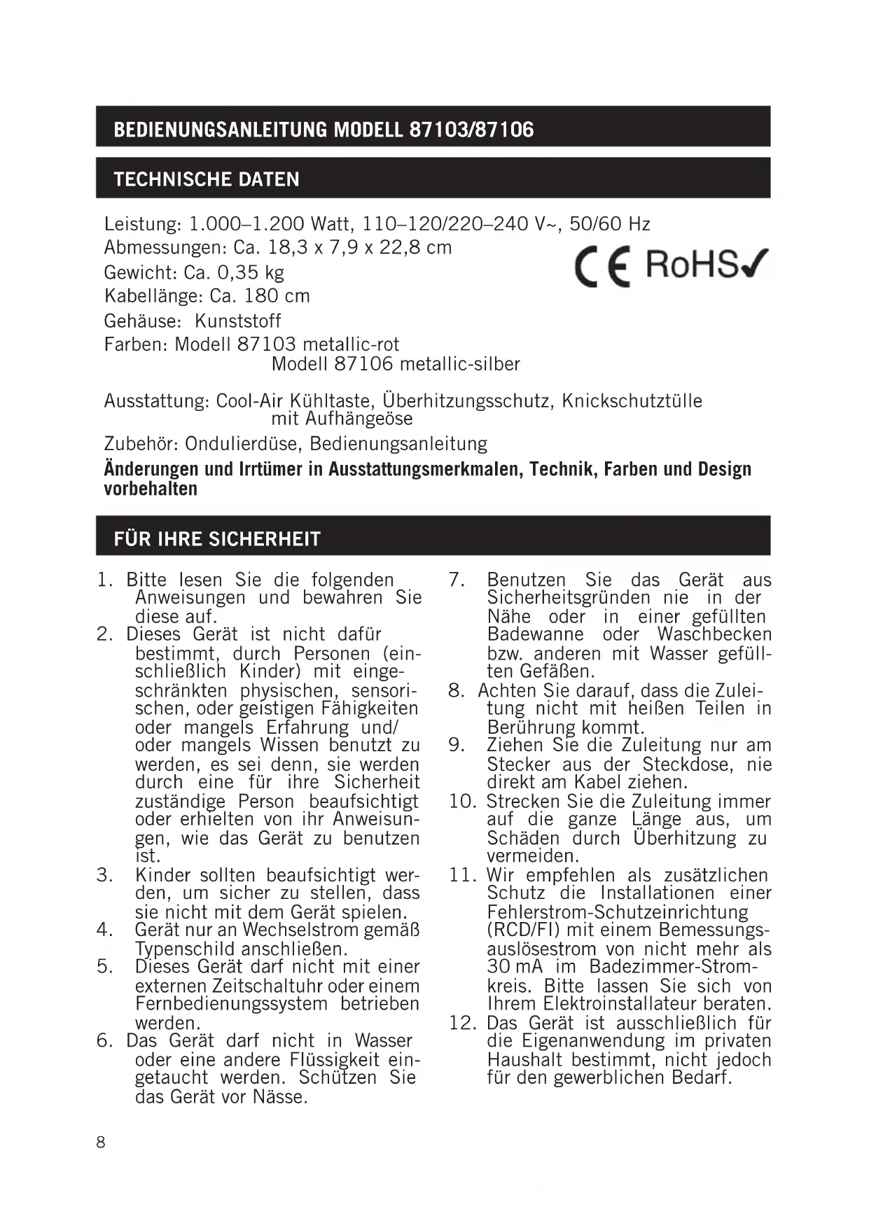 Hiermit erklärt die UNOLD AG, dass sich der Haartrockner Tazer 87103/87106 in Übereinstimmung