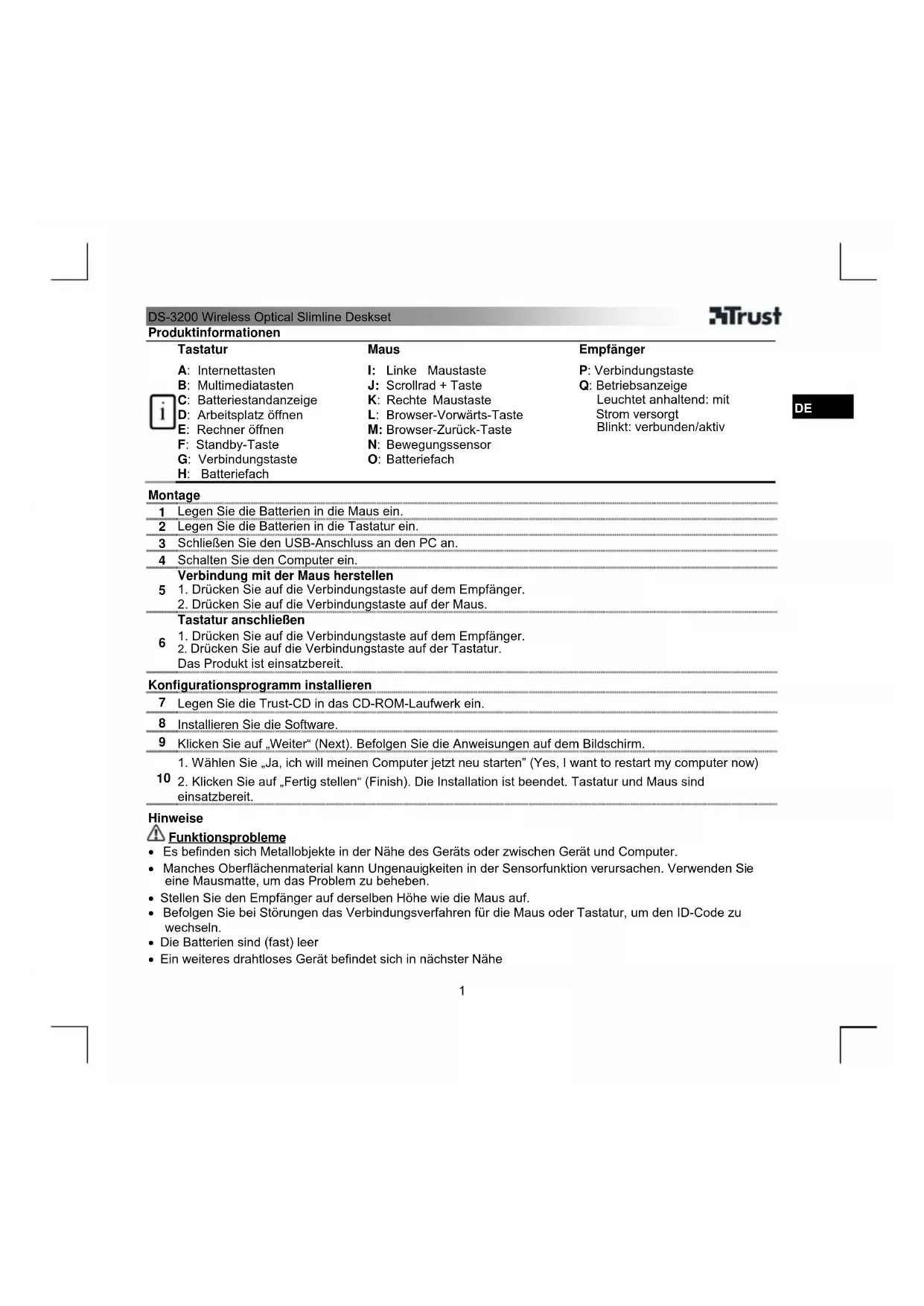 - Diese Anleitung darf ohne Genehmigung von Trust International B.V. weder ganz noch auszugsweise vervielfältigt werden.DS-3200 Wireless Optical Slimline Deskset