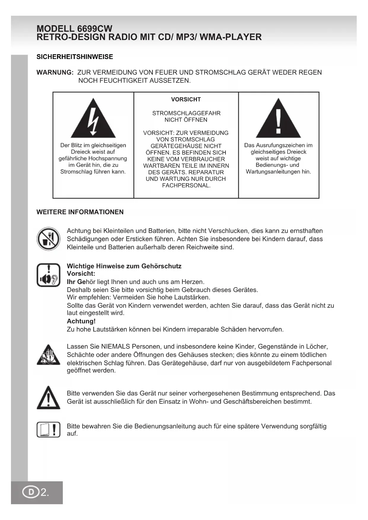Lassen Sie NIEMALS Personen, und insbesondere keine Kinder, Gegenstände in Locher, Schächte oder andere Öffnungen des Gehäuses stecken; dies könnte zu einem tödlichen elektrischen Schlag führen. Das Gerätegehause,arf nur von ausgebildetem Fachpersonal geöffnet werden.