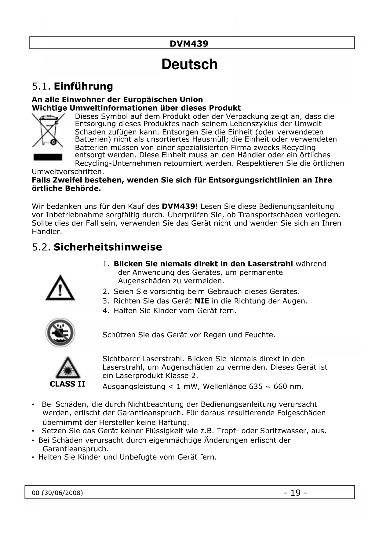 Das Gerät ist ein Laserprodukt Klasse 2 (Ausgangsleistung < 1 mW, Wellenlänge 635 ~ 660 nm). Blichen Sie niemals direkt in den Laserstrahl, um Augenschäden zu vermeiden.